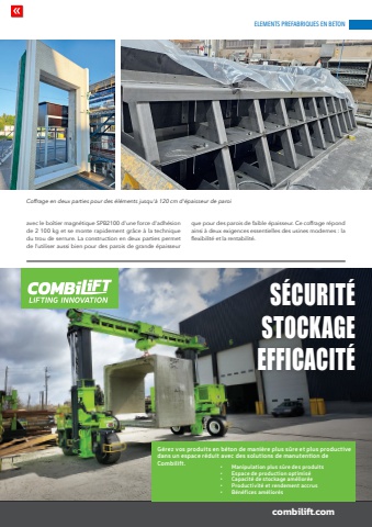 ELEMENTS PREFABRIQUES EN BETONwww.cpi-worldwide.com PBI %u2013 Pr%u00e9fa B%u00e9ton International %u2013 5 | 2025 135avec le bo%u00eetier magn%u00e9tique SPB2100 d'une force d'adh%u00e9sion de 2 100 kg et se monte rapidement gr%u00e2ce %u00e0 la technique du trou de serrure. La construction en deux parties permet de l'utiliser aussi bien pour des parois de grande %u00e9paisseur que pour des parois de faible %u00e9paisseur. Ce coffrage r%u00e9pond ainsi %u00e0 deux exigences essentielles des usines modernes : la flexibilit%u00e9 et la rentabilit%u00e9.Coffrage en deux parties pour des %u00e9l%u00e9ments jusqu'%u00e0 120 cm d'%u00e9paisseur de paroi25combilift.comS%u00c9CURIT%u00c9 STOCKAGEEFFICACIT%u00c9G%u00e9rez vos produits en b%u00e9ton de mani%u00e8re plus s%u00fbre et plus productive dans un espace r%u00e9duit avec des solutions de manutention de Combilift. %u2022 Manipulation plus s%u00fbre des produits%u2022 Espace de production optimis%u00e9%u2022 Capacit%u00e9 de stockage am%u00e9lior%u00e9e%u2022 Productivit%u00e9 et rendement accrus%u2022 B%u00e9n%u00e9fices am%u00e9lior%u00e9s