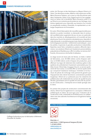 ELEMENTS PREFABRIQUES EN BETON140 PBI %u2013 Pr%u00e9fa B%u00e9ton International %u2013 5 | 2025 www.cpi-worldwide.comentier, de l'Europe et des Am%u00e9riques au Moyen-Orient et %u00e0 l'Asie. Ces derni%u00e8res ann%u00e9es, Alberto a %u00e9t%u00e9 rejoint par sa fille, Maria Giovanna Tedesco, qui a jou%u00e9 un r%u00f4le de premier plan dans l'entreprise. Gr%u00e2ce %u00e0 son regard neuf et %u00e0 son engagement en faveur de la durabilit%u00e9, Maria Giovanna veille %u00e0 ce qu'Olmet ne se contente pas de pr%u00e9server son h%u00e9ritage, mais %u00e9volue %u00e9galement pour r%u00e9pondre aux besoins d'un monde en perp%u00e9tuelle mutation. Ensemble, ils repr%u00e9sentent un m%u00e9lange d'exp%u00e9rience et d'innovation.En outre, Olmet Italy explore de nouvelles opportunit%u00e9s pour %u00e9tendre sa port%u00e9e mondiale. La demande dans le secteur de la pr%u00e9fabrication augmente de jour en jour, en particulier dans les march%u00e9s en d%u00e9veloppement, et la soci%u00e9t%u00e9 est bien plac%u00e9e pour fournir les solutions n%u00e9cessaires pour r%u00e9pondre %u00e0 cette demande. La soci%u00e9t%u00e9 propose %u00e0 ses clients des solutions technologiques avanc%u00e9es %u2013 enti%u00e8rement automatiques %u2013 pour les petites, moyennes et grandes productions industrielles. Expertise, savoir-faire, comp%u00e9tence, passion, efficacit%u00e9, dynamisme. Les solutions Olmet sont hautement personnalis%u00e9es, polyvalentes et flexibles pour offrir le meilleur en termes d'efficacit%u00e9, d'%u00e9conomie et de facilit%u00e9 d'utilisation.Le si%u00e8ge social est situ%u00e9 pr%u00e8s de Venise, en Italie. L'atelier de fabrication, avec 43 000 m%u00e8tres carr%u00e9s d'espace ext%u00e9rieur et 8 000 m%u00e8tres carr%u00e9s d'espace de production, peut effectuer tout type de traitement des mat%u00e9riaux gr%u00e2ce %u00e0 des syst%u00e8mes de pr%u00e9traitement hautement automatis%u00e9s pour les t%u00f4les d'acier. Olmet Italy s'engage %u00e0 fournir un service apr%u00e8svente de haut niveau. La soci%u00e9t%u00e9 offre un service apr%u00e8s-vente qui comprend l'assistance technique, l'entretien et la fourniture de pi%u00e8ces de rechange. Cela permet de garantir que l'%u00e9quipement des clients fonctionne correctement pendant longtemps. Olmet est un partenaire pour les industries de pr%u00e9fabrication afin d'atteindre les normes de qualit%u00e9 les plus %u00e9lev%u00e9es, garantissant ainsi la qualit%u00e9 et la s%u00e9curit%u00e9 du processus de construction ; l'entreprise est en totale synergie avec le client.En partant des projets de construction conventionnels des clients, Olmet fournit %u00e9galement la conception d'%u00e9l%u00e9ments pr%u00e9fabriqu%u00e9s en b%u00e9ton de tout type pour l'industrie de la construction civile, industrielle et d'infrastructure, en collaboration avec des cabinets d'architecture et d'ing%u00e9nierie italiens renomm%u00e9s. nAUTRES INFORMATIONSOlmet Italy s.r.l.vicolo Treviso, 1, 31040 Signoressa di Trevignano (TV), ItalieT +39 0423 670225info@olmetitaly.comwww.olmetitaly.comCoffrage hydraulique pour la fabrication d'%u00e9l%u00e9ments d'escalier en hauteur