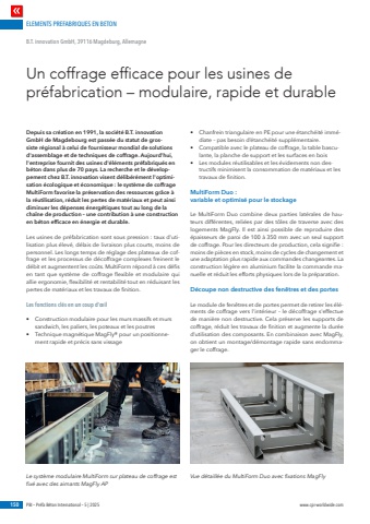 ELEMENTS PREFABRIQUES EN BETON150 PBI %u2013 Pr%u00e9fa B%u00e9ton International %u2013 5 | 2025 www.cpi-worldwide.comDepuis sa cr%u00e9ation en 1991, la soci%u00e9t%u00e9 B.T. innovation GmbH de Magdebourg est pass%u00e9e du statut de grossiste r%u00e9gional %u00e0 celui de fournisseur mondial de solutions d'assemblage et de techniques de coffrage. Aujourd'hui, l'entreprise fournit des usines d'%u00e9l%u00e9ments pr%u00e9fabriqu%u00e9s en b%u00e9ton dans plus de 70 pays. La recherche et le d%u00e9veloppement chez B.T. innovation visent d%u00e9lib%u00e9r%u00e9ment l'optimisation %u00e9cologique et %u00e9conomique : le syst%u00e8me de coffrage MultiForm favorise la pr%u00e9servation des ressources gr%u00e2ce %u00e0 la r%u00e9utilisation, r%u00e9duit les pertes de mat%u00e9riaux et peut ainsi diminuer les d%u00e9penses %u00e9nerg%u00e9tiques tout au long de la cha%u00eene de production %u2013 une contribution %u00e0 une construction en b%u00e9ton efficace en %u00e9nergie et durable.Les usines de pr%u00e9fabrication sont sous pression : taux d'utilisation plus %u00e9lev%u00e9, d%u00e9lais de livraison plus courts, moins de personnel. Les longs temps de r%u00e9glage des plateaux de coffrage et les processus de d%u00e9coffrage complexes freinent le d%u00e9bit et augmentent les co%u00fbts. MultiForm r%u00e9pond %u00e0 ces d%u00e9fis en tant que syst%u00e8me de coffrage flexible et modulaire qui allie ergonomie, flexibilit%u00e9 et rentabilit%u00e9 tout en r%u00e9duisant les pertes de mat%u00e9riaux et les travaux de finition.Les fonctions cl%u00e9s en un coup d'%u0153il%u2022 Construction modulaire pour les murs massifs et murs sandwich, les paliers, les poteaux et les poutres%u2022 Technique magn%u00e9tique MagFly%u00ae pour un positionnement rapide et pr%u00e9cis sans vissage%u2022 Chanfrein triangulaire en PE pour une %u00e9tanch%u00e9it%u00e9 imm%u00e9diate %u2013 pas besoin d%u2019%u00e9tanch%u00e9it%u00e9 suppl%u00e9mentaire.%u2022 Compatible avec le plateau de coffrage, la table basculante, la planche de support et les surfaces en bois%u2022 Les modules r%u00e9utilisables et les %u00e9videments non destructifs minimisent la consommation de mat%u00e9riaux et les travaux de finition.MultiForm Duo : variable et optimis%u00e9 pour le stockage Le MultiForm Duo combine deux parties lat%u00e9rales de hauteurs diff%u00e9rentes, reli%u00e9es par des t%u00f4les de traverse avec des logements MagFly. Il est ainsi possible de reproduire des %u00e9paisseurs de paroi de 100 %u00e0 350 mm avec un seul support de coffrage. Pour les directeurs de production, cela signifie : moins de pi%u00e8ces en stock, moins de cycles de changement et une adaptation plus rapide aux commandes changeantes. La construction l%u00e9g%u00e8re en aluminium facilite la commande manuelle et r%u00e9duit les efforts physiques lors de la pr%u00e9paration.D%u00e9coupe non destructive des fen%u00eatres et des portesLe module de fen%u00eatres et de portes permet de retirer les %u00e9l%u00e9ments de coffrage vers l'int%u00e9rieur %u2013 le d%u00e9coffrage s'effectue de mani%u00e8re non destructive. Cela pr%u00e9serve les supports de coffrage, r%u00e9duit les travaux de finition et augmente la dur%u00e9e d'utilisation des composants. En combinaison avec MagFly, on obtient un montage/d%u00e9montage rapide sans endommager le coffrage.Un coffrage efficace pour les usines de pr%u00e9fabrication %u2013 modulaire, rapide et durableB.T. innovation GmbH, 39116 Magdeburg, AllemagneLe syst%u00e8me modulaire MultiForm sur plateau de coffrage est fix%u00e9 avec des aimants MagFly APVue d%u00e9taill%u00e9e du MultiForm Duo avec fixations MagFly