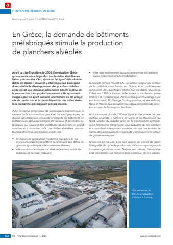 ELEMENTS PREFABRIQUES EN BETON152 PBI %u2013 Pr%u00e9fa B%u00e9ton International %u2013 5 | 2025 www.cpi-worldwide.comAvant la crise financi%u00e8re de 2008, il n%u2019existait en Gr%u00e8ce qu%u2019une seule usine de production de dalles alv%u00e9ol%u00e9es en b%u00e9ton pr%u00e9contraint. Ceci, ajout%u00e9 au fait que l%u2019utilisation de dalles en double T renvers%u00e9 y %u00e9tait beaucoup plus r%u00e9pandues, a frein%u00e9 le d%u00e9veloppement des planchers %u00e0 dalles alv%u00e9ol%u00e9es et leur utilisation g%u00e9n%u00e9ralis%u00e9e dans le secteur de la construction. Leur production a ensuite %u00e9t%u00e9 quasiment stopp%u00e9e, la crise ayant entra%u00een%u00e9 la fermeture de cet unique site de production et la quasi-disparition des dalles alv%u00e9ol%u00e9es du march%u00e9 grec pendant pr%u00e8s de dix ans.Avec la reprise progressive de la croissance %u00e9conomique, le secteur de la construction grec s%u2019est lui aussi peu %u00e0 peu redress%u00e9, g%u00e9n%u00e9rant une demande croissante de b%u00e2timents en pr%u00e9fabriqu%u00e9s %u00e0 plusieurs %u00e9tages, de bureaux et de centres logistiques qui devaient %u00eatre construits rapidement, en grand nombre et %u00e0 moindre co%u00fbt. Les dalles alv%u00e9ol%u00e9es pr%u00e9contraintes offrent ici une solution id%u00e9ale, car:%u2022 les lignes de production modernes %u00e9quip%u00e9es de machines d%u2019extrusion permettent de fabriquer des dalles en grandes quantit%u00e9s et %u00e0 des cadences %u00e9lev%u00e9es;%u2022 elles sont %u00e9conomiques car elles n%u00e9cessitent moins de mat%u00e9riau et de main-d%u2019%u0153uvre;%u2022 elles sont enti%u00e8rement autoportantes et ne n%u00e9cessitent aucun %u00e9taiement lors de l%u2019installation.La soci%u00e9t%u00e9 Armos Precast S.A., un acteur majeur du secteur de la pr%u00e9fabrication b%u00e9ton en Gr%u00e8ce, %u00e9tait parfaitement consciente des avantages offerts par les dalles alv%u00e9ol%u00e9es. Cr%u00e9%u00e9e en 1985 %u00e0 Larissa, ville situ%u00e9e %u00e0 mi-chemin entre Ath%u00e8nes et Thessalonique, Armos est aujourd%u2019hui dirig%u00e9e par son fondateur, M. George Orologopoulos, et ses enfants, Nikos et Vasiliki, qui occupent tous deux des postes de direction au sein de l%u2019entreprise familiale.Armos compte plus de 270 employ%u00e9s et des usines de production %u00e0 Larissa, %u00e0 Ath%u00e8nes, en Cr%u00e8te et en Mac%u00e9doine du Nord. Leader du march%u00e9 grec de la construction pr%u00e9fabriqu%u00e9e, l%u2019entreprise est r%u00e9put%u00e9e pour la qualit%u00e9 de ses produits et a contribu%u00e9 %u00e0 des projets majeurs tels que des tunnels de m%u00e9tro, des autoroutes et des projets d%u2019am%u00e9nagement urbain de grande envergure.Armos est en mesure, avec son propre personnel, de g%u00e9rer l%u2019int%u00e9gralit%u00e9 du cycle de production, de la conception jusqu%u2019%u00e0 l%u2019assemblage cl%u00e9 en main. Depuis ses d%u00e9buts, l%u2019entreprise s%u2019est concentr%u00e9e sur l%u2019am%u00e9lioration continue de ses procesEn Gr%u00e8ce, la demande de b%u00e2timents pr%u00e9fabriqu%u00e9s stimule la production de planchers alv%u00e9ol%u00e9sNordimpianti System Srl, 66100 Chieti (CH), ItalieVue a%u00e9rienne du site de production d%u2019Armos %u00e0 Larissa