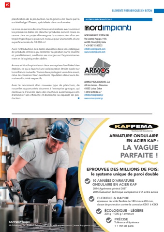 ELEMENTS PREFABRIQUES EN BETONwww.cpi-worldwide.com PBI %u2013 Pr%u00e9fa B%u00e9ton International %u2013 5 | 2025 157planification de la production. Ce logiciel a %u00e9t%u00e9 fourni par la soci%u00e9t%u00e9 belge i-Theses, sp%u00e9cialis%u00e9e dans ce domaine.La mise en service des machines a %u00e9t%u00e9 r%u00e9alis%u00e9e avec succ%u00e8s et les premi%u00e8res dalles de plancher produites ont %u00e9t%u00e9 mises en %u0153uvre dans un projet d%u2019envergure: la construction d%u2019un entrep%u00f4t frigorifique %u00e0 plusieurs niveaux pour Dianomefs, d%u2019une superficie totale de 10 000 m%u00b2.Avec l%u2019introduction des dalles alv%u00e9ol%u00e9es dans son catalogue de produits, Armos a pu renforcer sa position sur le march%u00e9 et, parall%u00e8lement, am%u00e9liorer ses marges sur l%u2019approvisionnement et la logistique des dalles.Armos et Nordimpianti sont deux entreprises familiales bien %u00e9tablies, ce qui a favoris%u00e9 une collaboration %u00e9troite bas%u00e9e sur la confiance mutuelle. Toutes deux partagent un m%u00eame souci, celui de conserver leur excellente r%u00e9putation dans leurs domaines d%u2019activit%u00e9 respectifs.Avec le lancement d%u2019un nouveau type de planchers, de nouvelles opportunit%u00e9s s%u2019ouvrent %u00e0 l%u2019entreprise grecque, qui continuera d%u2019investir dans des machines automatiques afin d%u2019am%u00e9liorer son efficacit%u00e9 et d%u2019accro%u00eetre sa capacit%u00e9 de production. nAUTRES INFORMATIONSNORDIMPIANTI SYSTEM SRLVia Erasmo Piaggio, 19/A66100 Chieti (CH), ItalieT +39 0871 540222info@nordimpianti.comwww.nordimpianti.comARMOS PROKATASKEVES S.A4th km Larisas %u2013 Sikouriou41002 Larisa, Gr%u00e8ceT 2410 575035-6-7info@armosprokat.grwww.armosprokat.grARMATURE ONDULAIRE EN ACIER KAP :LA VAGUE PARFAITE !10 ANN%u00c9ES D%u2019ARMATURE ONDULAIRE EN ACIER KAPFLEXIBLE & RAPIDE%u00c9COLOGIQUE %u2013 L%u00c9G%u00c8REPR%u00c9CISE%u00e9paisseur de voile fl exible de 180 mm %u00e0 600 mm,classe de protection contre la corrosion KSK1 %u00e0 KSK42014 Agr%u00e9ment g%u00e9n%u00e9ral DIBT2015 %u00c9valuation technique europ%u00e9enne ETA entre autres200 g - 1000 g / armatureTol%u00e9rance d%u2019%u00e9paisseur <-1 mm de paroiEPROUVEE DES MILLIONS DE FOIS:le systeme unique de paroi doubleKAPPEMA GmbHHolzhausen 2a | 83317 Teisendorf | offi ce@kappema.com | www.kappema.com