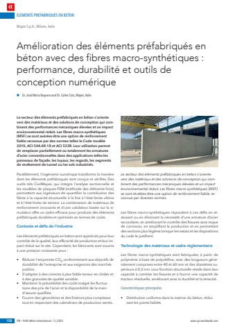 ELEMENTS PREFABRIQUES EN BETON158 PBI %u2013 Pr%u00e9fa B%u00e9ton International %u2013 5 | 2025 www.cpi-worldwide.comLe secteur des %u00e9l%u00e9ments pr%u00e9fabriqu%u00e9s en b%u00e9ton s'oriente vers des mat%u00e9riaux et des solutions de conception qui combinent des performances m%u00e9caniques %u00e9lev%u00e9es et un impact environnemental r%u00e9duit. Les fibres macro-synth%u00e9tiques (MSF) se sont av%u00e9r%u00e9es %u00eatre une option de renforcement fiable reconnue par des normes telles le Code mod%u00e8le 2010, ACI 544.4R-18 et ACI 533R. Leur utilisation permet de remplacer partiellement ou totalement les armatures d%u2019acier conventionnelles dans des applications telles les panneaux de fa%u00e7ade, les tuyaux, les regards, les segments de rev%u00eatement de tunnel ou les sols industriels.Parall%u00e8lement, l'ing%u00e9nierie num%u00e9rique transforme la mani%u00e8re dont les %u00e9l%u00e9ments pr%u00e9fabriqu%u00e9s sont con%u00e7us et v%u00e9rifi%u00e9s. Des outils tels CivilMapei, qui int%u00e8gre l'analyse sectionnelle et les mod%u00e8les de plaques FEM (m%u00e9thode des %u00e9l%u00e9ments finis), permettent aux ing%u00e9nieurs de quantifier la contribution des fibres %u00e0 la capacit%u00e9 structurelle %u00e0 la fois %u00e0 l'%u00e9tat limite ultime et %u00e0 l'%u00e9tat limite de service. La combinaison de mat%u00e9riaux de renforcement innovants et d'une validation bas%u00e9e sur la simulation offre un cadre efficace pour produire des %u00e9l%u00e9ments pr%u00e9fabriqu%u00e9s durables et optimis%u00e9s en termes de co%u00fbts.Contexte et d%u00e9fis de l'industrieLes %u00e9l%u00e9ments pr%u00e9fabriqu%u00e9s en b%u00e9ton sont appr%u00e9ci%u00e9s pour leur contr%u00f4le de la qualit%u00e9, leur efficacit%u00e9 de production et leur impact r%u00e9duit sur le site. Cependant, les fabricants sont soumis %u00e0 une pression croissante pour :%u2022 R%u00e9duire l'empreinte CO2 conform%u00e9ment aux objectifs de durabilit%u00e9 de l'entreprise et aux exigences des march%u00e9s publics.%u2022 S'adapter %u00e0 des ciments %u00e0 plus faible teneur en clinker et %u00e0 des granulats de qualit%u00e9 variable.%u2022 Maintenir la pr%u00e9visibilit%u00e9 des co%u00fbts malgr%u00e9 les fluctuations des prix de l'acier et la disponibilit%u00e9 de la maind'%u0153uvre qualifi%u00e9e.%u2022 Fournir des g%u00e9om%u00e9tries et des finitions plus complexes tout en respectant des calendriers de production serr%u00e9s.Les fibres macro-synth%u00e9tiques r%u00e9pondent %u00e0 ces d%u00e9fis en r%u00e9duisant ou en %u00e9liminant la n%u00e9cessit%u00e9 d'une armature d%u2019acier secondaire, en am%u00e9liorant le contr%u00f4le des fissures sans risque de corrosion, en simplifiant la production et en permettant des sections plus l%u00e9g%u00e8res lorsque les essais et les dispositions du code le justifient.Technologie des mat%u00e9riaux et cadre r%u00e9glementaireLes fibres macro-synth%u00e9tiques sont fabriqu%u00e9es %u00e0 partir de polym%u00e8res %u00e0 base de polyol%u00e9fine, avec des longueurs g%u00e9n%u00e9ralement comprises entre 40 et 60 mm et des diam%u00e8tres sup%u00e9rieurs %u00e0 0,3 mm. Leur fonction structurelle r%u00e9side dans leur capacit%u00e9 %u00e0 combler les fissures et %u00e0 fournir une capacit%u00e9 de traction r%u00e9siduelle, am%u00e9liorant ainsi la ductilit%u00e9 et la t%u00e9nacit%u00e9.Caract%u00e9ristiques principales%u2022 Distribution uniforme dans la matrice du b%u00e9ton, r%u00e9duisant les points faibles.Am%u00e9lioration des %u00e9l%u00e9ments pr%u00e9fabriqu%u00e9s en b%u00e9ton avec des fibres macro-synth%u00e9tiques : performance, durabilit%u00e9 et outils de conception num%u00e9riqueMapei S.p.A., Milano, Italien Dr. Jos%u00e9 Mar%u00eda Vaquero and Dr. Carles Cots, Mapei, ItalieLe secteur des %u00e9l%u00e9ments pr%u00e9fabriqu%u00e9s en b%u00e9ton s'oriente vers des mat%u00e9riaux et des solutions de conception qui combinent des performances m%u00e9caniques %u00e9lev%u00e9es et un impact environnemental r%u00e9duit. Les fibres macro-synth%u00e9tiques (MSF) se sont r%u00e9v%u00e9l%u00e9es %u00eatre une option de renforcement fiable, reconnue par diverses normes.