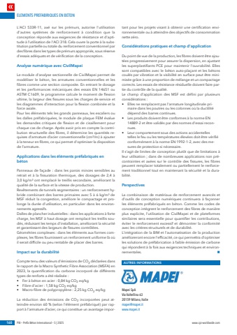 ELEMENTS PREFABRIQUES EN BETON160 PBI %u2013 Pr%u00e9fa B%u00e9ton International %u2013 5 | 2025 www.cpi-worldwide.comL'ACI 533R-11, ax%u00e9 sur les pr%u00e9murs, autorise l'utilisation d'autres syst%u00e8mes de renforcement %u00e0 condition que la conception r%u00e9ponde aux exigences de r%u00e9sistance et d'aptitude %u00e0 l%u2019utilisation de l'ACI 318. Cela ouvre la porte %u00e0 la substitution partielle ou totale du renforcement conventionnel par des fibres dans les types de pr%u00e9murs appropri%u00e9s, sous r%u00e9serve d'essais ad%u00e9quats et de v%u00e9rification de la conception.Analyse num%u00e9rique avec CivilMapeiLe module d'analyse sectionnelle de CivilMapei permet de mod%u00e9liser le b%u00e9ton, les armatures conventionnelles et les fibres comme une section composite. En entrant le dosage et les performances m%u00e9caniques des essais EN 14651 ou ASTM C1609, le programme calcule le moment de flexion ultime, la largeur des fissures sous les charges de service et les diagrammes d'interaction pour la flexion combin%u00e9e et la force axiale.Pour les %u00e9l%u00e9ments tels les grands panneaux, les escaliers ou les dalles pr%u00e9fabriqu%u00e9es, le module de plaque FEM %u00e9value les demandes critiques de flexion et de cisaillement pour chaque cas de charge. Apr%u00e8s avoir pris en compte la contribution structurelle des fibres, il d%u00e9termine les quantit%u00e9s requises d'armature d%u2019acier conventionnelle (cm%u00b2/m) %u00e0 ajouter %u00e0 la teneur en fibres, ce qui permet d'optimiser la disposition de l'armature.Applications dans les %u00e9l%u00e9ments pr%u00e9fabriqu%u00e9s en b%u00e9tonPanneaux de fa%u00e7ade : dans les parois minces sensibles au retrait et %u00e0 la fissuration thermique, des dosages de 2,4 %u00e0 3,0 kg/m%u00b3 ont remplac%u00e9 le treillis secondaire, am%u00e9liorant la qualit%u00e9 de la surface et la vitesse de production.Rev%u00eatements de tunnels segmentaires : un renforcement hybride combinant des barres primaires avec 5 %u00e0 6 kg/m%u00b3 de MSF r%u00e9duit la congestion, am%u00e9liore le compactage et prolonge la dur%u00e9e d%u2019utilisation, en particulier dans les environnements agressifs.Dalles de plancher industrielles : dans les applications %u00e0 forte charge, les MSF %u00e0 haut dosage ont remplac%u00e9 les treillis soud%u00e9s, r%u00e9duisant les temps d'installation, am%u00e9liorant la s%u00e9curit%u00e9 et garantissant des largeurs de fissures contr%u00f4l%u00e9es.G%u00e9om%u00e9tries complexes : dans les %u00e9l%u00e9ments aux formes complexes, les fibres fournissent un renforcement uniforme l%u00e0 o%u00f9 il serait difficile ou peu rentable de placer des barres.Impact sur la durabilit%u00e9Compte tenu des valeurs d'%u00e9missions de CO2 d%u00e9clar%u00e9es dans le rapport de la Macro Synthetic Fibre Association (MSFA) en 2023, la quantification du carbone incorpor%u00e9 de diff%u00e9rents types de renforts a %u00e9t%u00e9 r%u00e9alis%u00e9e : %u2022 Fer %u00e0 b%u00e9ton en acier : 0,84 kg CO2 eq/kg%u2022 Fibre d'acier : 1,58 kg CO2 eq/kg%u2022 Macro-fibre de polypropyl%u00e8ne : 2,25 kg CO2 eq/kgLa r%u00e9duction des %u00e9missions de CO2 incorpor%u00e9es peut atteindre environ 60 % (selon l'%u00e9l%u00e9ment pr%u00e9fabriqu%u00e9) par rapport %u00e0 l'armature d%u2019acier, ce qui constitue un avantage important pour les projets visant %u00e0 obtenir une certification environnementale ou %u00e0 atteindre des objectifs de consommation nette z%u00e9ro.Consid%u00e9rations pratiques et champ d'applicationDu point de vue de la production, les fibres doivent %u00eatre ajout%u00e9es progressivement pour assurer la dispersion, en ajustant les superplastifiants PCE pour maintenir l'ouvrabilit%u00e9. Elles sont compatibles avec le b%u00e9ton auto-pla%u00e7ant et les b%u00e9tons coul%u00e9s par vibration et la visibilit%u00e9 en surface peut %u00eatre minimis%u00e9e gr%u00e2ce %u00e0 une proportion de m%u00e9lange et un compactage corrects. Les essais de r%u00e9sistance r%u00e9siduelle doivent faire partie du contr%u00f4le de la qualit%u00e9.Le champ d'application des MSF est d%u00e9fini par plusieurs consid%u00e9rations :%u2022 Elles ne remplacent pas l'armature longitudinale primaire dans les poutres ou les colonnes o%u00f9 la ductilit%u00e9 d%u00e9pend des barres continues.%u2022 Les produits doivent %u00eatre conformes %u00e0 la norme EN 14889-2 et %u00eatre valid%u00e9s par des normes d'essai reconnues.%u2022 Leur comportement sous des actions accidentelles telles le feu ou les temp%u00e9ratures %u00e9lev%u00e9es doit %u00eatre v%u00e9rifi%u00e9 conform%u00e9ment %u00e0 la norme EN 1992-1-2, avec des mesures de protection si n%u00e9cessaire.Il s'agit de limites de conception plut%u00f4t que de limitations %u00e0 leur utilisation ; dans de nombreuses applications non pr%u00e9contraintes et ax%u00e9es sur le contr%u00f4le des fissures, les fibres peuvent remplacer totalement ou partiellement le renforcement traditionnel tout en maintenant la s%u00e9curit%u00e9 et la durabilit%u00e9.PerspectivesLa combinaison de mat%u00e9riaux de renforcement avanc%u00e9s et d'outils de conception num%u00e9riques continuera %u00e0 fa%u00e7onner les %u00e9l%u00e9ments pr%u00e9fabriqu%u00e9s en b%u00e9ton. Comme les codes de conception int%u00e8grent le renforcement des fibres de mani%u00e8re plus explicite, l'utilisation de CivilMapei et de plateformes similaires sera essentielle pour quantifier les contributions, %u00e9viter le renforcement excessif et d%u00e9montrer la conformit%u00e9 avec les crit%u00e8res structurels et de durabilit%u00e9.L'int%u00e9gration de la BIM et l'automatisation de la production am%u00e9lioreront encore l'efficacit%u00e9, ce qui permettra d'optimiser les solutions de pr%u00e9fabrication %u00e0 faible %u00e9mission de carbone qui r%u00e9pondent %u00e0 la fois aux exigences techniques et environnementales. nAUTRES INFORMATIONSMapei SpAVia Valtellina 6320159 Milano, Italiemapei@mapei.itwww.mapei.it