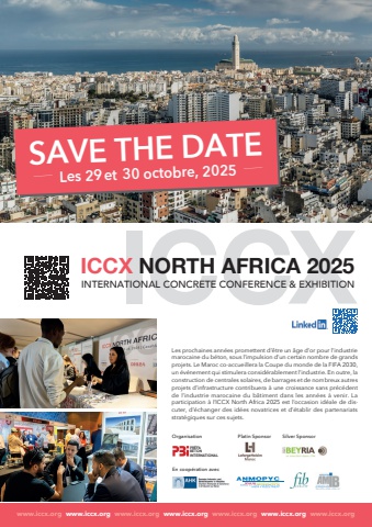 Les prochaines ann%u00e9es promettent d%u2019%u00eatre un %u00e2ge d%u2019or pour l%u2019industrie marocaine du b%u00e9ton, sous l%u2019impulsion d%u2019un certain nombre de grands projets. Le Maroc co-accueillera la Coupe du monde de la FIFA 2030, un %u00e9v%u00e9nement qui stimulera consid%u00e9rablement l%u2019industrie. En outre, la construction de centrales solaires, de barrages et de nombreux autres projets d%u2019infrastructure contribuera %u00e0 une croissance sans pr%u00e9c%u00e9dent de l%u2019industrie marocaine du b%u00e2timent dans les ann%u00e9es %u00e0 venir. La participation %u00e0 l%u2019ICCX North Africa 2025 est l%u2019occasion id%u00e9ale de discuter, d%u2019%u00e9changer des id%u00e9es novatrices et d%u2019%u00e9tablir des partenariats strat%u00e9giques sur ces sujets._ Les 29 et 30 octobre, 2025 SAVE THE DATE_INTERNATIONAL CONCRETE CONFERENCE & EXHIBITIONICCX NORTH AFRICA 2025www.iccx.org www.iccx.org www.iccx.org www.iccx.org www.iccx.org www.iccx.org www.iccx.orgPR%u00c9FA B%u00c9TON INTERNATIONALOrganisation Platin Sponsor Silver SponsorEn coop%u00e9ration avec
