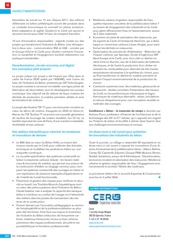 SALONS ET MANIFESTATIONS164 PBI %u2013 Pr%u00e9fa B%u00e9ton International %u2013 5 | 2025 www.cpi-worldwide.comkilom%u00e8tres de tunnel sur 15 ans. Depuis 2017, des millions d%u2019%u00e9l%u00e9ments en b%u00e9ton pr%u00e9fabriqu%u00e9s auront %u00e9t%u00e9 produits dans un contexte %u00e9conomique et normatif en pleine %u00e9volution. Entre adaptation et agilit%u00e9, Stradal et le Cerib ont %u0153uvr%u00e9 et %u0153uvrent encore pour b%u00e2tir le futur du transport francilien. 10 ans d%u2019innovation responsables : regards crois%u00e9s sur des projets qui transforment l%u2019Industrie du B%u00e9ton. Une r%u00e9trospective %u00e0 deux voix %u2013 communication RSE et QSE %u2013 anim%u00e9e par le Groupe H2d et le Cerib pour illustrer comment l%u2019innovation, la durabilit%u00e9 et l%u2019engagement soci%u00e9tal redessinent nos pratiques industrielles.Decarbonisation, circular economy and digital: two exemplary pilot projectsLe projet Juliper (ce projet a %u00e9t%u00e9 financ%u00e9 par l%u2019%u00c9tat dans le cadre de France 2030 op%u00e9r%u00e9 par l%u2019ADEME), vers l%u2019usine du futur de l%u2019Industrie du B%u00e9ton, pr%u00e9sent%u00e9 par Alfi Technologies. Le projet consiste %u00e0 concevoir et installer une ligne pilote de fabrication de blocs b%u00e9ton, tout en d%u00e9veloppant son jumeau num%u00e9rique. Son objectif est de r%u00e9duire de fa%u00e7on massive les d%u00e9chets de production, la mati%u00e8re premi%u00e8re utilis%u00e9e et ainsi les %u00e9missions de carbone. Le projet des Studios TSF 77 pour une %u00e9conomie circulaire au c%u0153ur du d%u00e9cor de cin%u00e9ma. Inaugur%u00e9s en 2024 en Seine-etMarne, les TSF Studios 77 incarnent une nouvelle g%u00e9n%u00e9ration de studios de tournage de cin%u00e9ma durables. Sur 52 ha, ce backlot reproduit les rues de Paris, d%u2019une mani%u00e8re modulable, r%u00e9utilisable et bas carbone.Des ateliers interactifs pour valoriser les tendances et innovations de demain %u2022 Le BIM data au c%u0153ur du B%u00e9ton Pr%u00e9fa, au travers des travaux men%u00e9s par le Cerib pour collecter des donn%u00e9es techniques et mod%u00e9liser les produits en b%u00e9ton sur une maquette num%u00e9rique. %u2022 La nouvelle sp%u00e9cification des syst%u00e8mes constructifs en b%u00e9ton %u00e0 empreinte carbone r%u00e9duite : les leviers mat%u00e9riaux & %u00e9conomie de mati%u00e8re, qui permet aux acteurs de la construction d%u2019%u00e9tablir un langage commun pour comparer les syst%u00e8mes constructifs des ouvrages en b%u00e9ton et une exploration de plusieurs exemples d%u2019applications et de l%u2019int%u00e9r%u00eat de l%u2019unit%u00e9 fonctionnelle.%u2022 Pr%u00e9vention et gestion des risques pour renforcer la s%u00e9curit%u00e9 au travail. Les Troubles Musculo Squelettiques sont au c%u0153ur des pr%u00e9occupations dans l%u2019Industrie du B%u00e9ton ; l%u2019%u00e9tude Exattrac vise %u00e0 analyser la capacit%u00e9 des exosquelettes %u00e0 contribuer au confort de l%u2019usager et %u00e0 l%u2019attractivit%u00e9 des m%u00e9tiers dans les postes de manutention des secteurs de la construction. %u2022 Former demain par l%u2019innovation p%u00e9dagogique au service de l%u2019employabilit%u00e9 et de la professionnalisation au plus pr%u00e8s des territoires. Faire face aux enjeux et %u00e9volutions de l%u2019Industrie du B%u00e9ton (r%u00e9duction de l%u2019empreinte carbone, mat%u00e9riaux biosourc%u00e9s, locaux ou bas carbone, pr%u00e9vention des risques professionnels, s%u00e9curit%u00e9 et responsabilit%u00e9) par la formation professionnelle.%u2022 R%u00e9silience urbaine et gestion responsable de l%u2019eau : quelles r%u00e9ponses concr%u00e8tes de la pr%u00e9fabrication b%u00e9ton ? au travers de l%u2019engagement des industriels et du Cerib pour g%u00e9rer efficacement l%u2019eau et l%u2019assainissement, autour de 5 axes essentiels.%u2022 %u00c9conomie circulaire & valorisation des ressources, par les experts du Cerib et l%u2019entreprise NeoCem, qui a d%u00e9velopp%u00e9 un ciment bas carbone %u00e0 base d%u2019argile, pour transformer les d%u00e9chets en ressources.%u2022 Optimisation du process de clink%u00e9risation - R%u00e9duction de l%u2019impact carbone, par Syensqo, l%u2019%u00e9cole d%u2019ing%u00e9nieurs IMT Nord Europe et le Cerib, avec d%u2019un c%u00f4t%u00e9 un d%u00e9chet min%u00e9ral riche en fluorine, issu de la fabrication de batteries %u00e9lectriques, et de l%u2019autre la production d%u2019un clinker n%u00e9cessitant du combustible pour atteindre les tr%u00e8s hautes temp%u00e9ratures n%u00e9cessaires %u00e0 la synth%u00e8se du ciment, pour au final transformer ce d%u00e9chet en mati%u00e8re premi%u00e8re r%u00e9duisant l%u2019impact environnemental de la production du ciment.%u2022 Construire autrement avec des mat%u00e9riaux g%u00e9osourc%u00e9s et biosourc%u00e9s : %u00e9tudes concr%u00e8tes. Pr%u00e9sentation des travaux du Cerib sur les performances m%u00e9caniques et hygrothermiques de mat%u00e9riaux alternatifs : essais, simulations et retours d%u2019exp%u00e9rience pour une conception durable et ma%u00eetris%u00e9e des ouvrages.Conf%u00e9rence %u00ab B%u00e9ton : la travers%u00e9e du temps %u00bb donn%u00e9e par Antoine Picon, professeur d%u2019histoire de l%u2019architecture et de la technologie des 20e et 21Ie si%u00e8cles, qui a apport%u00e9 son regard sur l%u2019histoire du b%u00e9ton et les d%u00e9fis %u00e0 relever dans l%u2019avenir, face aux challenges environnementaux et sociaux. Un show-room %u00e0 ciel ouvert pour pr%u00e9senter les innovations des industriels du b%u00e9ton Toute la journ%u00e9e, un village a rassembl%u00e9 40 exposants et un show-room %u00e0 ciel ouvert a expos%u00e9 les innovations d%u2019une dizaine d%u2019industriels de la pr%u00e9fabrication b%u00e9ton : Alkern, Befree, Carsey 3D, Capremib, Edycem, Groupe PBM, Muance, Rector, Stradal, Sotubema, autour de 4 th%u00e9matiques : D%u00e9carbonation, %u00e9conomie circulaire et valorisation des ressources / R