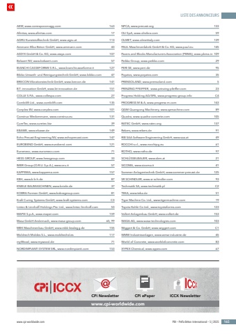 LISTE DES ANNONCEURSwww.cpi-worldwide.com PBI %u2013 Pr%u00e9fa B%u00e9ton International %u2013 5 | 2025 165AEM, www.conexpoconagg.com 163Afinitas, www.afinitas.com 17AGRU Kunststofftechnik GmbH, www.agru.at 113Ammann Elba Beton GmbH, www.ammann.com 43ASSYX GmbH & Co. KG, www.assyx.com 107Bekaert NV, www.bekaert.com 57BIANCHI CASSEFORME S.R.L., www.bianchicasseforme.it 127Bibko Umwelt- und Reinigungstechnik GmbH, www.bibko.com 47BRECON Vibrationstechnik GmbH, www.brecon.de 141B.T. innovation GmbH, www.bt-innovation.de 151COLLE S.P.A., www.collespa.com 27Combilift Ltd., www.combilift.com 135Conplex BV, www.conplex.com 101Construx Weckenmann, www.construx.eu 131CureTec, www.curetec.biz 39EBAWE, www.ebawe.de 149Echo Precast Engineering NV, www.echoprecast.com 147EUROBEND GmbH, www.eurobend.com 121Euromecc, www.euromecc.com 71HESS GROUP, www.hessgroup.com 33IMER Group (O.R.U. S.p.A.), www.oru.it 57KAPPEMA, www.kappema.com 157KBH, www.k-b-h.de 87KNIELE BAUMASCHINEN, www.kniele.de 37KOBRA Formen GmbH, www.kobragroup.com 81Kraft Curing Systems GmbH, www.kraft-systems.com C3Lintec & Linnhoff Holdings Pte. Ltd., www.lintec-linnhoff.com 53MAPEI S.p.A., www.mapei.com 159Masa GmbH Andernach, www.masa-group.com 65, 99MBK Maschinenbau GmbH, www.mbk-kisslegg.de 155Moldtech Moldes S.L., www.moldtechsl.es 117myWood, www.mywood.de 71NORDIMPIANTI SYSTEM SRL, www.nordimpianti.com 153NPCA, www.precast.org 133OLI SpA, www.olivibra.com 59OLMET, www.olmetitaly.com 139PAUL Maschinenfabrik GmbH & Co. KG, www.paul.eu 145Pavers and Blocks Manufacturers Association (PBMA), www.pbma.in 109Peikko Group, www.peikko.com 29PERI SE, www.peri.de 95Poyatos, www.poyatos.com 35PRENSOLAND, www.prensoland.com 5PRINZING PFEIFFER, www.prinzing-pfeiffer.com 23Progress Holding AG/SPA, www.progress-group.info C4PROGRESS M & A, www.progress-m.com 143QGM Quangong Machinery, www.qzmachine.com 89Quadra, www.quadra-concrete.com 105RATEC GmbH, www.ratec.org 137Rekers, www.rekers.de 91RIB SAA Software Engineering GmbH, www.saa.at 49ROCCHI s.r.l., www.rocchipg.eu 61ROTHO, www.rotho.de 97SCHL%u00dcSSELBAUER, www.sbm.at 21SICOMA, www.sicoma.it 41Sommer Anlagentechnik GmbH, www.sommer-precast.de 125SR SCHINDLER, www.sr-schindler.com 93Techmatik SA, www.techmatik.pl C2TEKA, www.teka.de 51Tiger Machine Co. Ltd., www.tigermachine.com 19Toyota Kohki Co Ltd., www.toyotaforms.com 123Vollert Anlagenbau GmbH, www.vollert.de 153WASA AG, www.wasa-technologies.com 103Wiggert & Co. GmbH, www.wiggert.com C1WMW Industrieanlagen, www.wmw-industrie.de 45World of Concrete, www.worldofconcrete.com 83XYPEX Chemical, www.xypex.com 67CPi Newsletter CPi ePaper ICCX Newsletterwww.cpi-worldwide.com