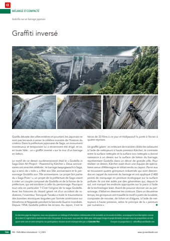M%u00c9LANG%u00c9 ET COMPACT%u00c9PBI %u2013 Pr%u00e9fa B%u00e9ton International %u2013 5 | 2025 www.cpi-worldwide.comEn derni%u00e8re page du magazine, nous vous proposons un m%u00e9lange d%u2018informations int%u00e9ressantes et de curiosit%u00e9s sur le monde du b%u00e9ton, accompagn%u00e9 d%u2018une description concise de ce dont il s%u2018agit et de la mani%u00e8re dont cela s%u2018est produit. Si vous aussi, vous avez des id%u00e9es pour cette page (image et projet de texte), envoyez-nous vos propositions en indiquant votre nom et votre entreprise. Les participations r%u00e9ussies seront r%u00e9compens%u00e9es par un Concrete Pen. Envoyez vos propositions %u00e0 : editor@cpi-worldwide.com166Graffiti invers%u00e9Godzilla sur un barrage japonaisGozilla d%u00e9vaste des villes enti%u00e8res et pourtant, les Japonais ne sont pas les seuls %u00e0 aimer le c%u00e9l%u00e8bre monstre de l%u2019histoire du cin%u00e9ma. Dans la pr%u00e9fecture japonaise de Saga, un monument monstrueux et temporaire lui a r%u00e9cemment %u00e9t%u00e9 %u00e9rig%u00e9, et ce, en toute h%u00e2te : un %u00ab graffiti invers%u00e9 %u00bb sur le mur d%u2019un barrage en b%u00e9ton.Le motif de ce dessin surdimensionn%u00e9 %u00e9tait le %u00ab Godzilla in Saga Dam Art Project %u2013 Powered by K%u00e4rcher %u00bb. Deux anniversaires ont ainsi %u00e9t%u00e9 c%u00e9l%u00e9br%u00e9s : le barrage Iwayagawachi %u00e0 Saga, qui a servi de %u00ab toile %u00bb, a f%u00eat%u00e9 son 50e anniversaire et le personnage Godzilla son 70e anniversaire. Le projet fait partie du %u00ab Saga Prize ! %u00bb, un projet de la pr%u00e9fecture de Saga visant %u00e0 cr%u00e9er un couple compos%u00e9 de Godzilla et de la forme de la pr%u00e9fecture, qui est similaire %u00e0 celle du personnage. Pourquoi tout cela en particulier ? C%u2019est l%u2019origine de la saga Godzilla. Avec les histoires du l%u00e9zard g%u00e9ant n%u00e9 d%u2019un accident de radiations, l%u2019inventeur Tomoyuki Tanaka a trait%u00e9 le traumatisme des bombes atomiques largu%u00e9es par l%u2019arm%u00e9e am%u00e9ricaine sur Hiroshima et Nagasaki pendant la Seconde Guerre mondiale. Depuis 1954, Godzilla pi%u00e9tine les %u00e9crans. Au Japon, il est le h%u00e9ros de 33 films %u00e0 ce jour et Hollywood l%u2019a port%u00e9 %u00e0 l%u2019%u00e9cran %u00e0 quatre reprises.Un graffiti g%u00e9ant : en enlevant de mani%u00e8re cibl%u00e9e les salissures %u00e0 l%u2019aide de nettoyeurs %u00e0 haute pression K%u00e4rcher, le contraste entre la surface nettoy%u00e9e et la surface non nettoy%u00e9e a donn%u00e9 naissance %u00e0 un dessin sur la surface de b%u00e9ton du barrage, repr%u00e9sentant Godzilla dans un d%u00e9cor de grande ville. Pour r%u00e9aliser ce dessin, K%u00e4rcher avait r%u00e9uni une %u00e9quipe de sp%u00e9cialistes venus d%u2019Allemagne et s%u2019%u00e9tait rendu au Japon. Parmi eux se trouvaient quatre grimpeurs industriels qui sont descendus en rappel du sommet du barrage et ont appliqu%u00e9 2 400 points de marquage en peinture %u00e9cologique sur la surface pollu%u00e9e. Ils ont %u00e9t%u00e9 aid%u00e9s par des g%u00e9om%u00e8tres qui, depuis le sol, ont marqu%u00e9 les endroits appropri%u00e9s sur la paroi %u00e0 l%u2019aide de la technologie laser. Avant de pouvoir donner vie au personnage, il fallait en dessiner les contours. Dans un deuxi%u00e8me temps, les grimpeurs ont travaill%u00e9 le motif %u00e0 partir de la salet%u00e9, compos%u00e9e de mousse, de lichen et d%u2019algues, %u00e0 l%u2019aide de nettoyeurs %u00e0 haute pression, selon le principe de la %u00ab peinture par num%u00e9ros %u00bb. nPhotos : TM & %u00a9 TOHO CO., LTD., fourni par K%u00e4rcher
