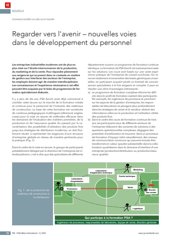 NOUVELLE18 PBI %u2013 Pr%u00e9fa B%u00e9ton International %u2013 5 | 2025 www.cpi-worldwide.comLes entreprises industrielles modernes ont de plus en plus mis%u00e9 sur l'%u00e9troite interconnexion de la production, du marketing et de la vente. Pour r%u00e9pondre pleinement aux exigences qui se posent dans ce contexte en mati%u00e8re de gestion aux interfaces des secteurs de l'entreprise, les employ%u00e9s doivent agir de mani%u00e8re interdisciplinaire. Les connaissances et l'exp%u00e9rience n%u00e9cessaires %u00e0 cet effet peuvent %u00eatre acquises par le biais de programmes de formation sp%u00e9cialement %u00e9labor%u00e9s.Il y a plus de dix ans, PSA Zurich avait d%u00e9j%u00e0 commenc%u00e9 %u00e0 combler cette lacune sur le march%u00e9 de la formation initiale et continue pour le personnel de l'industrie des mat%u00e9riaux de construction. La base de cette formation est constitu%u00e9e de contenus p%u00e9dagogiques multilingues (allemand, anglais, russe) pour la mise en %u0153uvre de m%u00e9thodes efficaces dans les domaines de l'%u00e9valuation des mati%u00e8res premi%u00e8res, de la production et de l'assurance qualit%u00e9. En passant par la caract%u00e9risation des possibilit%u00e9s d'utilisation des produits finis jusqu'aux strat%u00e9gies de distribution modernes, on doit finalement r%u00e9ussir %u00e0 repr%u00e9senter les exigences d'une structure d'entreprise globale en r%u00e9seau de mani%u00e8re pertinente pour la pratique. (Fig. 1). Dans le cadre de la mise en %u0153uvre, le groupe de participants pr%u00e9alablement d%u00e9sign%u00e9 par la direction de l'entreprise est interdisciplinaire, c'est-%u00e0-dire que des sp%u00e9cialistes de diff%u00e9rents d%u00e9partements suivent un programme de formation continue identique. La formation de PSA Zurich est exclusivement ax%u00e9e sur les solutions. Les cours sont bas%u00e9s sur une vaste exp%u00e9rience pratique de l'entreprise de conseil zurichoise. On renonce totalement %u00e0 transmettre des bases g%u00e9n%u00e9riques universelles. Le participant acquiert plut%u00f4t un %u00e9ventail de connaissances sp%u00e9cialis%u00e9es %u00e0 la fois exigeant et complet. Il peut en r%u00e9sulter une s%u00e9rie d'avantages int%u00e9ressants :a) Le programme de formation complexe %u00e9limine les d%u00e9ficits dans le profil de formation existant des participants. Par exemple, les ing%u00e9nieurs de processus se penchent sur les aspects de la gestion d'entreprise, les responsables de laboratoire se plongent plus profond%u00e9ment dans les strat%u00e9gies de vente et le vendeur obtient des informations utiles sur la production et l'utilisation cibl%u00e9e des produits finis.b) Dans le cadre des cours de formation continue de trois ans, les participants issus de diff%u00e9rents secteurs de l'entreprise %u00e9laborent des variantes de solutions %u00e0 des questions op%u00e9rationnelles complexes, d%u00e9gagent des potentiels d'am%u00e9lioration et trouvent, dans un processus de formation d'%u00e9quipe initi%u00e9 naturellement, des niveaux de communication communs qui peuvent ensuite %u00eatre transform%u00e9s en valeur ajout%u00e9e substantielle dans la collaboration quotidienne dans le domaine d'interface d'une entreprise (production/distribution ou production/assurance qualit%u00e9).Regarder vers l'avenir %u2013 nouvelles voies dans le d%u00e9veloppement du personnelComment combler un vide sur le march%u00e9fifffflffifl%u001a%u0019%u0018ffl%u0017%u0016%u0015ff%u0014%u0013%u0019%u0018%u0017%u0012%u0011%u0013%u0017%u0019%u0013%u0010fl%u001a%u001a%u000f%u000effi%u0013%u000e%u000c%u0013%u0017%u0019%u0013%u000e%u000b%u0015fflff%u0015%u0019ffl%u0018ff%u0013ffi%u0009%u0013%u0008%u0007%u0006ffl%u0018%u0019%u0015%u0019%u0018ffl%u0017%u0005%u0013%u0017%u0019ff%u0013%u0019%u0013%u001a%u0004%u0017%u0018%u0003fl%u0013%u000b%u0015fflff%u0015%u0019ffl%u0018ff%u0013ffi%u0009%u0015%u0007%u0007%u0006%u0018%u001a%u0015%u0019%u0018ffl%u0017%u0019%u0013%u001a%u0004%u0017%u0018%u0003fl%u0013%u000bffl%u0012%u0018%u000e%u0019%u0018%u0003fl%u0013fi%u0001fffflffi%u0001fl%u0001ff%u001a%u0081%u008d%u0019%u0018ffl%u0017ffi%u0001%u0018%u0016 %u0015%u008f%u0090 %u009dfifffflffifffl%u001a%u0019%u0018%u0017 %u0016%u001a%u0015%u0014%u0018%u0013%u0012%u001a%u0017%u0017%u0019%u0017%u0011%u0015%u0018%u001a%u0017%u0014%u0013ff%u0017%u0010%u000f%u000e%u001a%u0017%u0015%u0016%u001a%u0015%u000e%u0010%u000f%u0013%u0018%u0010%u0013fl%u0018%u001a%u0011%u0015ffi%u000c%u0019fl%u0014%u001a%u0015%u0016%u001a%u0015%u000b%u001aff%u001a%u0011%u0015%u0016fl%u0018%u001a%u0012fl%u0013ff%u0015fflffiffffi%u0018%u0010%u000e%u001aFig. 1 : de la production de mat%u00e9riaux de construction %u00e0 la distribution