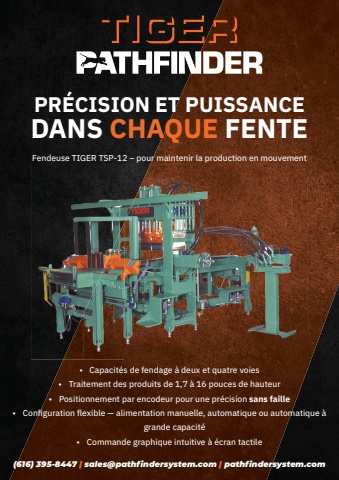 (616) 395-8447 | sales@pathfindersystem.com | pathfindersystem.com%u2022 Capacit%u00e9s de fendage %u00e0 deux et quatre voies%u2022 Traitement des produits de 1,7 %u00e0 16 pouces de hauteur%u2022 Positionnement par encodeur pour une pr%u00e9cision sans faille%u2022 Configuration flexible %u2014 alimentation manuelle, automatique ou automatique %u00e0 grande capacit%u00e9%u2022 Commande graphique intuitive %u00e0 %u00e9cran tactilePR%u00c9CISION ET PUISSANCEFendeuse TIGER TSP-12 %u2013 pour maintenir la production en mouvementDANS CHAQUE FENTE
