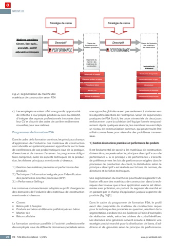 NOUVELLE20 PBI %u2013 Pr%u00e9fa B%u00e9ton International %u2013 5 | 2025 www.cpi-worldwide.comc) Les employ%u00e9s se voient offrir une grande opportunit%u00e9 de r%u00e9fl%u00e9chir %u00e0 leur propre position au sein du collectif, d'int%u00e9grer des aspects professionnels innovants dans leur CV et d'ouvrir des voies de carri%u00e8re enti%u00e8rement nouvelles pour eux-m%u00eames. Programmes de formation PSADans le cadre de la formation continue, les principaux champs d'application de l'industrie des mat%u00e9riaux de construction sont abord%u00e9s et syst%u00e9matiquement approfondis sur la base de conf%u00e9rences, de cas probl%u00e9matiques issus de la pratique, d'exercices et de travaux d'examen. Le programme obligatoire comprend, outre les aspects techniques de la production, les th%u00e8mes principaux mentionn%u00e9s ci-dessous.1.) Gestion des mati%u00e8res premi%u00e8res et performance des produits2.) Technique d'information int%u00e9grale pour l'identification des param%u00e8tres orient%u00e9e processus (IIPP)3.) %u00ab Performance Selling %u00bbLes contenus sont exactement adapt%u00e9s au profil d'exigences des domaines de l'industrie des mat%u00e9riaux de construction mentionn%u00e9s ci-dessous :%u2022 Ciment%u2022 B%u00e9ton pr%u00eat %u00e0 l%u2019emploi%u2022 Produits en b%u00e9ton et %u00e9l%u00e9ments pr%u00e9fabriqu%u00e9s en b%u00e9ton%u2022 Mortier sec%u2022 B%u00e9ton cellulaireLa formation continue parall%u00e8le %u00e0 l'activit%u00e9 professionnelle des employ%u00e9s issus de diff%u00e9rents domaines sp%u00e9cialis%u00e9s selon une approche globale ne sert pas seulement %u00e0 s'orienter vers les objectifs essentiels de l'entreprise. Selon les exp%u00e9riences pratiques de PSA Zurich, les cours trimestriels de deux jours renforcent en outre la coh%u00e9sion de l'%u00e9quipe form%u00e9e temporairement. Apr%u00e8s quelques s%u00e9ances, les membres trouvent d%u00e9j%u00e0 un niveau de communication commun, qui peut ensuite %u00eatre utilis%u00e9 comme base pour r%u00e9soudre des probl%u00e8mes transversaux. 1.) Gestion des mati%u00e8res premi%u00e8res et performance des produitsIl est fondamental de savoir si les mat%u00e9riaux de construction doivent %u00eatre propos%u00e9s selon le principe %u00ab descriptif %u00bb ou %u00ab de performance %u00bb. Si le principe %u00ab de performance %u00bb s'oriente de pr%u00e9f%u00e9rence vers les lois de performance exig%u00e9es dans le processus de production du client, la distribution selon le principe %u00ab descriptif %u00bb est r%u00e9alis%u00e9e sur la base de normes, de directives et de fiches techniques.Une segmentation du march%u00e9 ne peut toutefois garantir l'utilisation efficace des mat%u00e9riaux de construction dans la techniques des travaux que si leur application exacte est d%u00e9termin%u00e9e avec pr%u00e9cision, en partant du segment de march%u00e9 et en passant par le champ d'application jusqu'%u00e0 la gamme de produits (fig. 3) [1].Dans le cadre du programme de formation PSA, le profil exact des propri%u00e9t%u00e9s du mat%u00e9riau de construction requis pour la technique des proc%u00e9d%u00e9s en question, r%u00e9sultant de la segmentation, est donc mis en %u00e9vidence %u00e0 l'aide d'exemples de r%u00e9alisation r%u00e9els, selon les crit%u00e8res de co%u00fbts/b%u00e9n%u00e9fices. Les donn%u00e9es ainsi g%u00e9n%u00e9r%u00e9es servent ensuite %u00e0 %u00e9laborer une strat%u00e9gie produit-march%u00e9 pour la distribution de liants, d'additions et de granulats selon le principe de performance. fifffflffifl%u001a%u0019%u0018%u0017%u0016%u001a%u0019%u0015ffifl%u001a%u0019%u0018%u0014ffi%u0015%u0019%u0013ffl%u0012%u0017%u0011ffiff%u0013ffl%u0017%u0018%u0016%u0010%u000ffi%u0012%u0017%u000e%u001aff%u0013%u0011ffffl%u0018%u0012%u0017ff%u000c%u000cffifflffi%u000bff%u000cffff%u0013ffl%u0018%u0017%u000f%u0009ffi%u0015ffi%u0008%u0019%u0018fififffffifflfflffifl %u001aflffiflfl%u0019fifl%u0018%u0017fifffflffifl%u001a %u0019%u001aff%u0018%u0017%u0016%u0015%u0019ffiffi%u0019ffl%u001aff%u0018fl%u0019%u0017%u0014%u0018%u001a%u0018ffi%u0019ffl%u0016%u0013ffi%u001afl%u0017%u001a%u0016fl%u0014%u0013ffififffflffifl%u001a%u0019%u0018%u001a%u0017fifffflffifl%u001a%u0019%u0018%u0017 fflffi%u0016%u0015%u001a%u0018%u0014%u0017ff%u001afifffflffifl%u001a%u0019%u0018%u001a%u0017 %u0012%u0011%u0014fflffifl%u001a %u0019ffl %u0011%u0010%u0014ffi%u0019%u001a%u001afl%u0017%u0014ffl%u0019ffl%u001a ff%u0018fl%u0019%u0017%u0014%u0018%u001a%u0018%u0019ffl %u0016%u0013ffi%u001afl%u0017%u001a%u0016fl%u0014%u0013ffifififffffifflfflffifl %u001aflffiflfl%u0019fifl%u0013fifffflffi fl%u001a%u0019ff %u0018%u0017%u0007%u0017%u0016%u0015fl%u0007ffl%u0014%u0013%u0007fi%u0015%u0016ffiff%u0012 fl%u001afi%u0011%u0010%u0006%u000f %u0016ffi%u0017%u0006fifffflffi%u000e%u001affl%u000c%u0014ff%u0012 %u0016ffi%u0017%u0006fifffflffi%u0012%u0011%u000bffl%u0010%u000ffifffflffifl%u001a %u0019%u0018 %u0017fl%u0016%u0018%u0015%u0018%u001affl%u0014%u0013fl%u001a%u0014ffl%u0012fifffflffifl%u001a ffi%u001a%u0019fi%u0014ffl%u0005%u0017%u0018ffl %u0014%u0011%u0010ff%u0005%u000f%u001a%u000e%u0012%u0004%u0014ffl%u0012fifffflfi%u0012%u0018%u000bffl%u001aff%u0014%u0016%u001a %u0016 %u0018fffl%u001a%u0014ffl%u0012fifffflffifl%u001a %u0018ffl %u0012%u0010%u001afl%u000c%u0004fflffifl%u001a%u0013fl%u001a%u0014ffl%u0012fifffflffifl%u001a%u0014 %u000e%u001a%u0018%u0012%u0016ffi%u0018 %u0012%u0018%u001aflfi%u000c%u0005%u0012%u0011%u0014fflffifl%u001a %u0019ffl%u001a%u000f%u0013%u001a%u0017ffi%u0014%u001a%u001affl%u001a%u0017%u001a %u0019fflff%u0018fl%u0014%u000e%u0017ffl%u001a %u0017fflff%u0014%u000e%u0017ffl%u001a%u0009fifffflffffi fl%u001a%u0017%u0006%u0019%u0018fffflffi%u0017%u0018Fig. 2 : segmentation du march%u00e9 des mat%u00e9riaux de construction selon PSA
