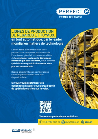 +43 7735 7144-0 sbm@sbm.at sbm.atLe bon degr%u00e9 d%u2018automatisation vous permettra de remporter plus de succ%u00e8s. Fournisseur global et reconnu en mati%u00e8re de technologie, tant pour le d%u00e9moulage imm%u00e9diat que pour le diff%u00e9r%u00e9, nous sommes sp%u00e9cialistes en produits innovants et en process automatis%u00e9s.Depuis plus de 40 ans nos innovations sont des pas essentiels vers plus de productivit%u00e9. Si vous voulez optimiser vos cadences %u00e0 l%u2019avenir vous aurez besoin de sp%u00e9cialistes tri%u00e9s sur le volet. Venez nous parler de vos ambitions. LIGNES DE PRODUCTION DE REGARDS ET TUYAUX, en tout automatique, par le leader mondial en mati%u00e8re de technologie