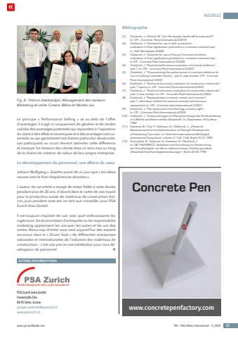 NOUVELLEwww.cpi-worldwide.com PBI %u2013 Pr%u00e9fa B%u00e9ton International %u2013 5 | 2025 25Le principe %u00ab Performance Selling %u00bb va au-del%u00e0 de l'offre d'avantages. Il s'agit ici uniquement de g%u00e9n%u00e9rer et de rendre visibles des avantages potentiels qui r%u00e9pondent %u00e0 l'aspiration du client %u00e0 des effets %u00e9conomiques et %u00e0 des avantages concurrentiels, ou qui garantissent son besoin particulier de s%u00e9curit%u00e9. Les participants au cours doivent assimiler cette diff%u00e9rence et marquer les besoins des clients dans ce sens tout au long de la cha%u00eene de cr%u00e9ation de valeur de leur propre entreprise.Le d%u00e9veloppement du personnel, une affaire de c%u0153ur Johann Wolfgang v. Goethe aurait dit un jour que %u00ab les id%u00e9es neuves sont le fruit d%u2019exp%u00e9riences abouties %u00bb.L'auteur de cet article a essay%u00e9 de rester fid%u00e8le %u00e0 cette devise pendant plus de 20 ans, d'abord dans le cadre de son travail pour le producteur suisse de mat%u00e9riaux de construction Holcim, puis pendant onze ans en tant que conseiller pour PSA Zurich Area GmbH.Il est toujours inspirant de voir avec quel enthousiasme les ing%u00e9nieurs, les %u00e9conomistes d'entreprise ou les responsables marketing apprennent les uns avec les autres et les uns des autres. Beaucoup d'entre vous sont aujourd'hui des experts reconnus dans le %u00ab Driver Seat %u00bb de diff%u00e9rentes entreprises nationales et internationales de l'industrie des mat%u00e9riaux de construction %u2013 c'est une joie et une satisfaction pour tout d%u00e9veloppeur de personnel. nBibliographie[1] Oecknick, J.; Erhardt, M. %u201cCan the fa%u00e7ade handicraft be exported?%u201d; In: CPI %u2013 Concrete Plant International 2/2018[2] Oecknick, J. %u201cCements for use in AAC production %u2013 evaluation of their application potential in a customer-oriented way%u201d In: AAC Worldwide 4/2020[3] Oecknick, J. %u201cCements for use in Precast Concrete Industries %u2013 evaluation of their application potential in a customer-oriented way%u201d; In CPI %u2013 Concrete Plant International 5/2020[4] Oecknick, J. %u201cPractical performance evaluation of mineral additions%u201d; part 1; In: CPI %u2013 Concrete Plant International 4/2021[5] Oecknick, J. %u201cCharacterizing the performance of concrete additions for use in building materials industry %u2013 part 2, case studies%u201d CPI %u2013 Concrete Plant International 5/2021[6] Oecknick, J. %u201cTechnical-economic evaluation of construction chemicals%u201d; part, 1 basics; In: CPI %u2013 Concrete Plant International 4/2022[7] Oecknick, J. %u201cTechnical-economic evaluation of construction chemicals%u201d; part, 2 case studies; In: CPI %u2013 Concrete Plant International 6/2022[8] Oecknick, J. %u201cNanoparticles in cement, mortar and concrete%u201d; part 1, laboratory method for practice-oriented performance assessment; In: CPI %u2013 Concrete plant International 3/2023[9] Oecknick, J. %u201cThe measurement technology must be right%u201d; In: CPI %u2013 Concrete Plant International 6/2024[10] Oecknick, J. %u201cUntersuchungen zur Phenomenologie der Strukturbildung von M%u00f6rtel und Beton mittels Ultraschall%u201c; In: Dissertation, IH Cottbus 1982 [11] Kaessner, B.; Frey, P.; Gebauer, G.; Oecknick, J., %u201eUltrasonic Measurements for the Determination of Strength Development of Hardening Concrete%u201d; In. Fachinformationsdienst BAUdigital, International Symposium, volume 2 1165-1168, Berlin 01.01.1995 [12] Krompholz, R.; Gebauer, G.; Kaessner, B.; Oecknick, J. In: DE 19629485C2 %u201eVerfahren und Vorrichtung zur Bestimmung der Druckfestigkeit von Beton w%u00e4hrend dessen Erh%u00e4rtung mittels Ultraschall-Geschwindigkeitsmessungen%u201c; Berlin 20.05.1998 AUTRES INFORMATIONSPSA Zurich Area GmbHFreiestra%u00dfe 24a8610 Uster, Suissejuergen.oecknick@psazurich.chwww.psazurich.chFig. 8 : Holcim Azerba%u00efdjan, Management des secteurs Marketing et vente Ciment, B%u00e9ton et Mortier secConcrete Pen www.concretepenfactory.com
