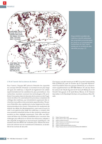 NOUVELLE28 PBI %u2013 Pr%u00e9fa B%u00e9ton International %u2013 5 | 2025 www.cpi-worldwide.comL'IA et l'avenir de la science du b%u00e9tonPour l'avenir, l'%u00e9quipe MIT pr%u00e9voit d'%u00e9tendre les capacit%u00e9s du concept d'IA afin d'%u00e9valuer un %u00e9ventail encore plus large de types de mat%u00e9riaux. L'objectif est %u00e9galement de valider exp%u00e9rimentalement les substituts les plus prometteurs. Ces recherches montrent comment les technologies d'IA acc%u00e9l%u00e8rent l'innovation dans le domaine de la science et de l'ing%u00e9nierie du b%u00e9ton. En automatisant les processus complexes de criblage des mat%u00e9riaux, qui n%u00e9cessitaient auparavant des recherches manuelles et documentaires approfondies, l'IA permet d'identifier plus rapidement et plus largement les substituts prometteurs du ciment. Cela permet non seulement de r%u00e9duire les d%u00e9lais de d%u00e9veloppement, mais aussi d'ouvrir la voie %u00e0 une gamme plus large de mat%u00e9riaux, y compris des sous-produits industriels locaux et des min%u00e9raux naturels qui auraient pu %u00eatre n%u00e9glig%u00e9s auparavant. Cela offre aux fabricants de b%u00e9ton de nouvelles possibilit%u00e9s pour concevoir des m%u00e9langes plus efficaces en termes de ressources, adapt%u00e9s %u00e0 des objectifs %u00e9cologiques et %u00e9conomiques sp%u00e9cifiques. L'IA soutient ainsi les efforts de l'industrie pour r%u00e9duire les %u00e9missions de carbone tout en maintenant la r%u00e9sistance, la durabilit%u00e9 et les normes de s%u00e9curit%u00e9.Ces travaux ont %u00e9t%u00e9 men%u00e9s par le MIT Concrete Sustainability Hub (CSHub) [3], avec le soutien de la Concrete Advancement Foundation [4] et du groupe Olivetti [5], et un financement suppl%u00e9mentaire du MIT-IBM Watson AI Lab [6]. Parmi les auteurs de l'%u00e9tude figurent le Dr Soroush Mahjoubi, le Dr Vineeth Venugopal, le Dr Ipek Bensu Manav, le Dr Hessam AzariJafari, le Dr Randolph Kirchain et le professeur Elsa Olivetti. n[1] https://www.astm.org/[2] https://store.astm.org/c1897-20.html[3] https://cshub.mit.edu/[4] https://www.concreteadvancement.org/[5] https://olivetti.mit.edu/[6] https://mitibmwatsonailab.mit.edu/[7] https://www.nature.com/articles/s43246-025-00820-4Disponibilit%u00e9 mondiale des mat%u00e9riaux r%u00e9actifs pr%u00e9sentant des propri%u00e9t%u00e9s pouzzolaniques (en haut) ou un comportement hydraulique (en bas), repr%u00e9sent%u00e9e par le nombre de sites identifi%u00e9s par pays. [7]