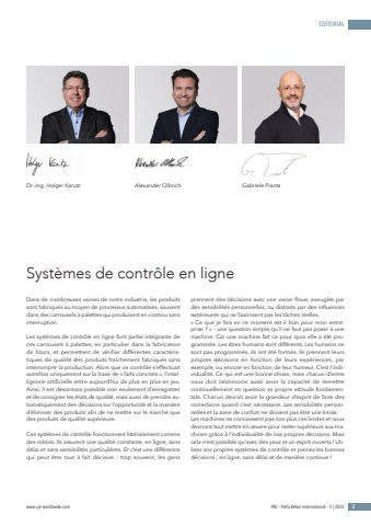 www.cpi-worldwide.com PBI %u2013 Pr%u00e9fa B%u00e9ton International %u2013 5 | 2025 3EDITORIALSyst%u00e8mes de contr%u00f4le en ligneDans de nombreuses usines de notre industrie, les produits sont fabriqu%u00e9s au moyen de processus automatis%u00e9s, souvent dans des carrousels %u00e0 palettes qui produisent en continu sans interruption.Les syst%u00e8mes de contr%u00f4le en ligne font partie int%u00e9grante de ces carrousels %u00e0 palettes, en particulier dans la fabrication de blocs, et permettent de v%u00e9rifier diff%u00e9rentes caract%u00e9ristiques de qualit%u00e9 des produits fra%u00eechement fabriqu%u00e9s sans interrompre la production. Alors que ce contr%u00f4le s%u2019effectuait autrefois uniquement sur la base de %u00ab faits concrets %u00bb, l%u2019intelligence artificielle entre aujourd%u2019hui de plus en plus en jeu. Ainsi, il est d%u00e9sormais possible non seulement d%u2019enregistrer et de consigner les %u00e9tats de qualit%u00e9, mais aussi de prendre automatiquement des d%u00e9cisions sur l%u2019opportunit%u00e9 et la mani%u00e8re d%u2019%u00e9liminer des produits afin de ne mettre sur le march%u00e9 que des produits de qualit%u00e9 sup%u00e9rieure.Ces syst%u00e8mes de contr%u00f4le fonctionnent litt%u00e9ralement comme des robots. Ils assurent une qualit%u00e9 constante, en ligne, sans d%u00e9lai et sans sensibilit%u00e9s particuli%u00e8res. Et c%u2019est une diff%u00e9rence qui peut %u00eatre tout %u00e0 fait d%u00e9cisive : trop souvent, les gens prennent des d%u00e9cisions avec une vision floue, aveugl%u00e9s par des sensibilit%u00e9s personnelles, ou distraits par des influences ext%u00e9rieures qui ne favorisent pas les t%u00e2ches r%u00e9elles.%u00ab Ce que je fais en ce moment est-il bon pour mon entreprise ? %u00bb %u2013 une question simple qu%u2019il ne faut pas poser %u00e0 une machine. Car une machine fait ce pour quoi elle a %u00e9t%u00e9 programm%u00e9e. Les %u00eatres humains sont diff%u00e9rents. Les humains ne sont pas programm%u00e9s, ils ont %u00e9t%u00e9 form%u00e9s. Ils prennent leurs propres d%u00e9cisions en fonction de leurs exp%u00e9riences, par exemple, ou encore en fonction de leur humeur. C%u2019est l%u2019individualit%u00e9. Ce qui est une bonne chose, mais chacun d%u2019entre nous doit n%u00e9anmoins aussi avoir la capacit%u00e9 de remettre continuellement en question sa propre attitude fondamentale. Chacun devrait avoir la grandeur d%u2019esprit de faire des corrections quand c%u2019est n%u00e9cessaire. Les sensibilit%u00e9s personnelles et la zone de confort ne doivent pas %u00eatre une limite.Les machines ne connaissent pas non plus ces limites et nous devrions tout mettre en %u0153uvre pour rester sup%u00e9rieurs aux machines gr%u00e2ce %u00e0 l%u2019individualit%u00e9 de nos propres d%u00e9cisions. Mais cela n%u2019est possible qu%u2019avec des yeux et un esprit ouverts ! Utilisez vos propres syst%u00e8mes de contr%u00f4le et prenez les bonnes d%u00e9cisions ; en ligne, sans d%u00e9lai et de mani%u00e8re continue !Dr.-Ing. Holger Karutz Alexander Olbrich Gabriele Pianta