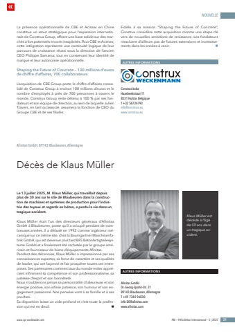 NOUVELLEwww.cpi-worldwide.com PBI %u2013 Pr%u00e9fa B%u00e9ton International %u2013 5 | 2025 31La pr%u00e9sence op%u00e9rationnelle de CBE et Acimex en Chine constitue un atout strat%u00e9gique pour l%u2019expansion internationale de Construx Group, offrant une base solide sur des march%u00e9s %u00e0 fort potentiels encore inexploit%u00e9s. Pour CBE et Acimex, cette int%u00e9gration repr%u00e9sente une continuit%u00e9 logique de leur parcours de croissance r%u00e9ussi sous la direction de l%u2019ancien CEO Philippe Samama, tout en conservant leur identit%u00e9 de marque et leur autonomie op%u00e9rationnelle.Shaping the Future of Concrete %u2013 100 millions d%u2019euros de chiffre d%u2019affaires, 700 collaborateursL%u2019acquisition de CBE Group porte le chiffre d%u2019affaires consolid%u00e9 de Construx Group %u00e0 environ 100 millions d%u2019euros et le nombre d%u2019employ%u00e9s %u00e0 pr%u00e8s de 700 personnes %u00e0 travers le monde. Construx Group reste d%u00e9tenu %u00e0 100 % par ses fondateurs et son %u00e9quipe de direction, au sein de laquelle Julien Travers, en tant qu%u2019associ%u00e9, assumera la fonction de CEO du Groupe CBE et de ses filiales.Fid%u00e8le %u00e0 sa mission %u201cShaping the Future of Concrete%u201d, Construx consid%u00e8re cette acquisition comme une %u00e9tape cl%u00e9 vers de nouvelles ambitions de croissance. Les fondateurs n%u2019excluent d%u2019ailleurs pas de futures extensions et investissements dans les ann%u00e9es %u00e0 venir. nAUTRES INFORMATIONSConstrux bvba Hazebeekstraat 11 8531 Hulste, Belgique T +32 56724793 info@construx.eu www.construx.euLe 13 juillet 2025, M. Klaus M%u00fcller, qui travaillait depuis plus de 30 ans sur le site de Blaubeuren dans la construction de machines et syst%u00e8mes de production pour l%u2019industrie des tuyaux et regards en b%u00e9ton, a perdu la vie dans un tragique accident.Klaus M%u00fcller %u00e9tait l%u2019un des directeurs g%u00e9n%u00e9raux d%u2019Afinitas GmbH %u00e0 Blaubeuren, poste qu%u2019il a occup%u00e9 pendant de nombreuses ann%u00e9es. Il a d%u00e9but%u00e9 en 1992 comme ing%u00e9nieur m%u00e9canique sur ce m%u00eame site, chez la Baumgartner Maschinenfabrik GmbH, qui est devenue plus tard BFS Betonfertigteilesysteme GmbH et a finalement %u00e9t%u00e9 rachet%u00e9e par le groupe am%u00e9ricain et fournisseur de biens d%u2019%u00e9quipements Afinitas.Pendant des d%u00e9cennies, Klaus M%u00fcller a impressionn%u00e9 par ses connaissances expertes, sa force de caract%u00e8re et ses qualit%u00e9s de leader, qui ont fa%u00e7onn%u00e9 et fait prosp%u00e9rer toutes ces entreprises. Ses partenaires commerciaux du monde entier appr%u00e9cient infiniment sa comp%u00e9tence et son professionnalisme, sa justesse d%u2019esprit et son honn%u00eatet%u00e9. Nous n%u2019oublierons jamais sa personnalit%u00e9 chaleureuse et son %u00e9nergie positive, son infinie patience, son humour et son engagement passionn%u00e9. Nos pens%u00e9es vont %u00e0 sa famille et %u00e0 ses proches. Sa disparition laisse un vide profond et c%u2019est toute la profession qui est en deuil. nD%u00e9c%u00e8s de Klaus M%u00fcllerAfinitas GmbH, 89143 Blaubeuren, AllemagneAUTRES INFORMATIONSAfinitas GmbHDr.-Georg-Spohn-Str. 3189143 Blaubeuren, AllemagneT +49 7344 96030info-DE@afinitas.comwww.afinitas.comKlaus M%u00fcller est d%u00e9c%u00e9d%u00e9 %u00e0 l%u2019%u00e2ge de 59 ans dans un tragique accident.