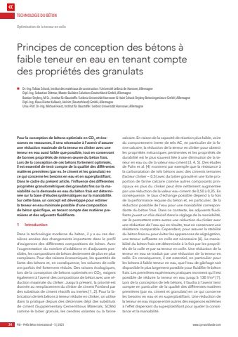TECHNOLOGIE DU B%u00c9TON34 PBI %u2013 Pr%u00e9fa B%u00e9ton International %u2013 5 | 2025 www.cpi-worldwide.comPour la conception de b%u00e9tons optimis%u00e9s en CO2 et %u00e9conomes en ressources, il sera n%u00e9cessaire %u00e0 l'avenir d'assurer une r%u00e9duction maximale de la teneur en clinker avec une teneur en eau aussi faible que possible, tout en conservant de bonnes propri%u00e9t%u00e9s de mise en %u0153uvre du b%u00e9ton frais. Lors de la conception de ces b%u00e9tons fortement optimis%u00e9s, il est essentiel de tenir compte de la qualit%u00e9 des diff%u00e9rentes mati%u00e8res premi%u00e8res (par ex. le ciment et les granulats) en ce qui concerne les besoins en eau et en superplastifiant. Dans le cadre du pr%u00e9sent article, l'influence des diff%u00e9rentes propri%u00e9t%u00e9s granulom%u00e9triques des granulats fins sur la maniabilit%u00e9 ou la demande en eau du b%u00e9ton frais est d%u00e9termin%u00e9e sur la base d'%u00e9tudes syst%u00e9matiques sur la maniabilit%u00e9. Sur cette base, un concept est d%u00e9velopp%u00e9 pour estimer la teneur en eau minimale possible d'une composition de b%u00e9ton sp%u00e9cifique, en tenant compte des mati%u00e8res premi%u00e8res et des adjuvants fluidifiants. 1 IntroductionDans la technologie moderne du b%u00e9ton, il y a eu ces derni%u00e8res ann%u00e9es des changements importants dans le profil d'exigences des diff%u00e9rentes compositions de b%u00e9ton. Avec l'augmentation du nombre d'additions et d'adjuvants possibles, les compositions de b%u00e9ton deviennent de plus en plus complexes. Pour des raisons %u00e9conomiques, les quantit%u00e9s de liants des b%u00e9tons et, en cons%u00e9quence, les volumes de colle ont parfois %u00e9t%u00e9 fortement r%u00e9duits. Des raisons %u00e9cologiques, lors de la conception de b%u00e9tons optimis%u00e9s en CO2, exigent %u00e9galement %u00e0 l'avenir des compositions de b%u00e9ton avec une r%u00e9duction maximale du clinker. Jusqu'%u00e0 pr%u00e9sent, la priorit%u00e9 est donn%u00e9e au remplacement du clinker de ciment Portland par des substituts de ciment r%u00e9actifs ou inertes [1, 2]. Pour la fabrication de tels b%u00e9tons %u00e0 teneur r%u00e9duite en clinker, on utilise dans la pratique depuis des d%u00e9cennies d%u00e9j%u00e0 des substituts de ciment (Supplementary Cementitious Materials, SCMs) comme le laitier granul%u00e9, les cendres volantes ou la farine calcaire. En raison de la capacit%u00e9 de r%u00e9action plus faible, voire du comportement inerte de tels AC, en particulier de la farine calcaire, la r%u00e9duction de la teneur en clinker pour obtenir les propri%u00e9t%u00e9s m%u00e9caniques pertinentes et les propri%u00e9t%u00e9s de durabilit%u00e9 est le plus souvent li%u00e9e %u00e0 une diminution de la teneur en eau ou de la valeur eau-ciment [3, 4, 5]. Des %u00e9tudes de Palm et al. [4] montrent par exemple que la r%u00e9sistance %u00e0 la carbonatation de tels b%u00e9tons avec des ciments ternaires (facteur clinker ~ 0,5) avec du laitier granul%u00e9 et une forte proportion de farine calcaire comme autres composants principaux en plus du clinker peut %u00eatre nettement augment%u00e9e par une r%u00e9duction de la valeur eau-ciment de 0,50 %u00e0 0,35. En cons%u00e9quence, le taux d'%u00e9change possible d%u00e9pend %u00e0 la fois de la performance requise du b%u00e9ton et, en particulier, de la r%u00e9duction possible de l'eau pour une maniabilit%u00e9 correspondante du b%u00e9ton frais. Dans ce contexte, les adjuvants fluidifiants jouent un r%u00f4le d%u00e9cisif dans le r%u00e9glage de la maniabilit%u00e9, car ils permettent entre autres une r%u00e9duction du clinker avec une r%u00e9duction de l'eau qui en r%u00e9sulte, tout en conservant une r%u00e9sistance comparable. Cependant, pour assurer la stabilit%u00e9 du b%u00e9ton frais ou pour %u00e9viter les apparences de s%u00e9gr%u00e9gation, une teneur suffisante en colle est n%u00e9cessaire [6]. La maniabilit%u00e9 du b%u00e9ton frais est d%u00e9termin%u00e9e %u00e0 la fois par les propri%u00e9t%u00e9s de la colle et par sa teneur en colle. Une r%u00e9duction de la teneur en eau se traduit par une r%u00e9duction de la teneur en colle. En cons%u00e9quence, il est essentiel, en particulier pour les b%u00e9tons %u00e0 faible teneur en eau, que l'eau de g%u00e2chage soit disponible le plus largement possible pour fluidifier le b%u00e9ton frais. Les premi%u00e8res exp%u00e9riences pratiques montrent qu'il est possible de r%u00e9duire la teneur en eau jusqu'%u00e0 130 l/m%u00b3 [7]. Lors de la conception de tels b%u00e9tons, il faudra %u00e0 l'avenir tenir compte en particulier de la qualit%u00e9 des diff%u00e9rentes mati%u00e8res premi%u00e8res (par ex. ciment et granulats) en ce qui concerne les besoins en eau et en superplastifiant. Une r%u00e9duction de la teneur en eau impose entre autres des exigences extr%u00eames %u00e0 l'effet dispersant du superplastifiant pour ajuster la consistance et la maniabilit%u00e9.Principes de conception des b%u00e9tons %u00e0 faible teneur en eau en tenant compte des propri%u00e9t%u00e9s des granulatsOptimisation de la teneur en collen Dr.-Ing. Tobias Schack, Institut des mat%u00e9riaux de construction / Universit%u00e9 Leibniz de Hanovre, AllemagneDipl.-Ing. Sebastian Dittmar, Master Builders Solutions Deutschland GmbH, AllemagneBastian Strybny, M.Sc., Institut f%u00fcr Baustoffe / Leibniz Universit%u00e4t Hannover & Haist Schack Strybny Betoningenieure GmbH, AllemagneDipl.-Ing. Klaus-Dieter Kallweit, Holcim (Deutschland) GmbH, AllemagneUniv.-Prof. Dr.-Ing. Michael Haist, Institut f%u00fcr Baustoffe / Leibniz Universit%u00e4t Hannover, Allemagne