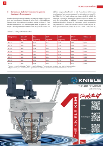 TECHNOLOGIE DU B%u00c9TONwww.cpi-worldwide.com PBI %u2013 Pr%u00e9fa B%u00e9ton International %u2013 5 | 2025 373 Consistance du b%u00e9ton frais dans le syst%u00e8me classique %u00e0 3 composantsDans un premier temps, la teneur en eau n%u00e9cessaire pour obtenir une consistance donn%u00e9e du b%u00e9ton frais a %u00e9t%u00e9 %u00e9tudi%u00e9e en faisant varier les mati%u00e8res premi%u00e8res (sable et ciment). Pour ce faire, des b%u00e9tons ont %u00e9t%u00e9 fabriqu%u00e9s selon le syst%u00e8me classique %u00e0 3 composants en faisant varier le type de ciment (Z1 %u00e0 Z4) et les granulats fins (S1 et S4). Pour obtenir diff%u00e9rentes consistances, la teneur en eau a %u00e9t%u00e9 syst%u00e9matiquement vari%u00e9e de 170 %u00e0 234 l/m%u00b3 ou la valeur eau-ciment de 0,50 %u00e0 0,65. En outre, on a fait varier la teneur en ciment et donc la teneur en colle des b%u00e9tons frais. Le tableau 3 r%u00e9sume les compositions de b%u00e9ton %u00e9tudi%u00e9es. Il appara%u00eet clairement que la proportion de granulats fins a %u00e9t%u00e9 maintenue constante dans chaque cas, alors que la teneur en ciment et en eau a vari%u00e9. Lorsque la teTableau 3 : compositions de b%u00e9tonD%u00e9signation Ciment1) Eau 0/22) 2/83) 8/164) Valeur e-c[kg/dm%u00b3] [kg/dm%u00b3] [kg/dm%u00b3] [kg/dm%u00b3] [kg/dm%u00b3] [%u2013]M1-1 340 170 656 416 783 0,50M1-2 340 187 656 416 738 0,55M1-3 340 204 656 416 694 0,60M1-4 340 221 656 416 649 0,65M2-1 360 180 656 416 738 0,50M2-2 360 198 656 416 694 0,55M2-3 360 216 656 416 649 0,60M2-4 360 234 656 416 602 0,651) Ciment Z1-Z4 (cf. tableau 2), 2) Sable S1-S4 (cf. tableau 1), 3) Teneur et type constants pour tous les b%u00e9tons %u00e9tudi%u00e9s 4) Type constant pour tous les b%u00e9tons ; ajustement volum%u00e9trique de la teneur en fonction de la teneur en eauTHE KNIELE KKMWeb:Catalogue:Movie:THE ART OF MIXINGMade in Germany