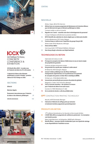 CONTENUPBI %u2013 Pr%u00e9fa B%u00e9ton International %u2013 5 | 2025 www.cpi-worldwide.com7462NOUVELLEAfinitas, Clayton, MO 63105, Etats-Unis16%u0009 Afinitas lance son nouveau programme de Maintenance et d%u2019entretien Alliancepour les fabricants de tuyaux et %u00e9l%u00e9ments pr%u00e9fabriqu%u00e9s en b%u00e9tonComment combler un vide sur le march%u00e918%u0009 Regarder vers l'avenir %u2013 nouvelles voies dans le d%u00e9veloppement du personnelConcept d'intelligence artificielle dans la production de b%u00e9ton26%u0009 MIT-KI identifie des substituts du ciment adapt%u00e9s pour un b%u00e9ton plus durableConstrux Weckenmann, 8531 Hulste, Belgique30%u0009 Construx Group se renforce avec l%u2019acquisition du groupe fran%u00e7ais CBEAfinitas GmbH, 89143 Blaubeuren, Allemagne31%u0009 D%u00e9c%u00e8s de Klaus M%u00fcllerHess Group GmbH, 57299 Burbach-Wahlbach, Allemagne 32%u0009 Hess Group %u00e9largit sa direction avec Ralph QuellmalzTECHNOLOGIE DU BETON Optimisation de la teneur en colle34%u0009 Principes de conception des b%u00e9tons %u00e0 faible teneur en eau en tenant comptedes propri%u00e9t%u00e9s des granulatsProduction de b%u00e9ton et %u00e9conomie circulaire46%u0009 Des granulats fins recycl%u00e9s pour remplacer le sable naturelNV Bekaert SA, 8550 Zwevegem, Belgique54%u0009 Innover le b%u00e9ton pr%u00e9fabriqu%u00e9 avec des fibres m%u00e9talliques :Enseignements exp%u00e9rimentaux sur les performances et le potentielde conception des poutres en b%u00e9ton fibr%u00e9 %u00e0 m%u00e9talliques (BRFM)OLI Italy S.p.A., 41036 Medolla (MO), Italie58%u0009 Innovaciones personalizadas para procesos de producci%u00f3n globalesWiggert & Co. GmbH, 76227 Karlsruhe, Allemagne 62%u0009 Trust in Concrete Innovation %u2013 des solutions sur mesurepour l'industrie du b%u00e9ton d'une seule sourceEuromecc Srl, 95045 Misterbianco CT, Italie70%u0009 De la centrale de chantier a celle de prefabbricationWasa AG, 64293 Darmstadt, Allemagne 74%u0009 Fabrication d'%u00e9l%u00e9ments de coffrage pr%u00e9cis par extrusionet traitement du b%u00e9ton programm%u00e9s param%u00e9triquementPRODUITS EN BETON13e Conf%u00e9rence Internationale sur les chauss%u00e9es en blocs et pav%u00e9s de b%u00e9ton 80%u0009 L%u2019ICCBP 2026 offrira un programme de conf%u00e9rences passionnant %u2013 les inscriptionssont bient%u00f4t ouvertesRekers GmbH Maschinen- und Anlagenbau, 48480 Spelle, Allemagne 82%u0009 Retrofit efficace %u2013 nouveaux chariots transbordeurs pour une capacit%u00e9 de stockageet une disponibilit%u00e9 de l'installation accruesICCX North Africa 2025 %u2013 le rendez-vousde l%u2019industrie du b%u00e9ton les 29 et 30 octobre%u0009 8L%u2019industrie du b%u00e9ton et des %u00e9l%u00e9mentspr%u00e9fabriqu%u00e9s se r%u00e9unit %u00e0 Istanbul : premi%u00e8re%u00e9dition de l%u2019ICCX T%u00fcrkiye en 2026 14SECTIONSEditorial%u0009 3Mentions l%u00e9gales%u0009 7%u00c9v%u00e9nements internationaux pour l%u2019industriedu b%u00e9ton et des %u00e9l%u00e9ments pr%u00e9fabriqu%u00e9s 29Liste de annonceurs 165INTERNATIONAL CONCRETECONFERENCE & EXHIBITION