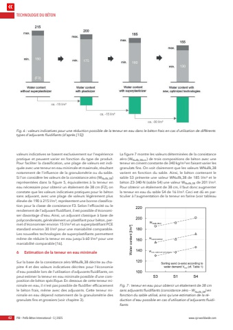 TECHNOLOGIE DU B%u00c9TON42 PBI %u2013 Pr%u00e9fa B%u00e9ton International %u2013 5 | 2025 www.cpi-worldwide.comvaleurs indicatives se basent exclusivement sur l'exp%u00e9rience pratique et peuvent varier en fonction du type de produit. Pour faciliter la classification, une plage de valeurs est indiqu%u00e9e avec une teneur en eau minimale et maximale, r%u00e9sultant notamment de l'influence de la granulom%u00e9trie ou du sable. Si l'on consid%u00e8re les valeurs de la consistance z%u00e9ro (WNullk,38) repr%u00e9sent%u00e9es dans la figure 5, %u00e9quivalentes %u00e0 la teneur en eau n%u00e9cessaire pour obtenir un %u00e9talement de 38 cm (F2), on constate que les valeurs indicatives pratiques pour le b%u00e9ton sans adjuvant, avec une plage de valeurs l%u00e9g%u00e8rement plus %u00e9lev%u00e9e de 190 %u00e0 215 l/m%u00b3, repr%u00e9sentent une bonne classification pour la classe de consistance F3. Selon l'efficacit%u00e9 ou le rendement de l'adjuvant fluidifiant, il est possible d'%u00e9conomiser davantage d'eau. Ainsi, un adjuvant classique %u00e0 base de polycondensats, g%u00e9n%u00e9ralement un plastifiant pour b%u00e9ton, permet d'%u00e9conomiser environ 15 l/m%u00b3 et un superplastifiant PCE standard environ 30 l/m%u00b3 pour une maniabilit%u00e9 comparable. Les nouvelles technologies de superplastifiants permettent m%u00eame de r%u00e9duire la teneur en eau jusqu'%u00e0 60 l/m%u00b3 pour une maniabilit%u00e9 comparable [16]. 6 Estimation de la teneur en eau minimaleSur la base de la consistance z%u00e9ro WNullk,38 d%u00e9crite au chapitre 4 et des valeurs indicatives d%u00e9crites pour l'%u00e9conomie d'eau possible lors de l'utilisation d'adjuvants fluidifiants, on peut estimer la teneur en eau minimale possible d'une composition de b%u00e9ton sp%u00e9cifique. En dessous de cette teneur minimale en eau, il n'est pas possible de fluidifier efficacement le b%u00e9ton frais, m%u00eame avec des adjuvants. Cette teneur minimale en eau d%u00e9pend notamment de la granulom%u00e9trie des granulats fins et grossiers (voir chapitre 3).La figure 7 montre les valeurs d%u00e9termin%u00e9es de la consistance z%u00e9ro (WNullk,38cm) de trois compositions de b%u00e9ton avec une teneur en ciment constante de 340 kg/m%u00b3 en faisant varier les granulats fins. On voit clairement que les valeurs WNullk,38 varient en fonction du sable. Ainsi, le b%u00e9ton contenant le sable S3 pr%u00e9sente une valeur WNullk,38 de 185 l/m%u00b3 et le b%u00e9ton Z3-340-N (sable S4) une valeur WNullk,38 de 201 l/m%u00b3. Pour obtenir un %u00e9talement de 38 cm, il faut donc augmenter la teneur en eau du sable S4 de 16 l/m%u00b3. Ceci est d%u00fb en particulier %u00e0 l'augmentation de la teneur en farine (voir tableau Fig. 6 : valeurs indicatives pour une r%u00e9duction possible de la teneur en eau dans le b%u00e9ton frais en cas d'utilisation de diff%u00e9rents types d'adjuvants fluidifiants (d'apr%u00e8s [15])Fig. 7 : teneur en eau pour obtenir un %u00e9talement de 38 cm sans adjuvants fluidifiants (consistance z%u00e9ro %u2013 WNullk,38) en fonction du sable utilis%u00e9, ainsi qu'une estimation de la r%u00e9duction d'eau possible en cas d'utilisation d'adjuvants fluidifiants