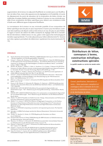 TECHNOLOGIE DU B%u00c9TONwww.cpi-worldwide.com PBI %u2013 Pr%u00e9fa B%u00e9ton International %u2013 5 | 2025augmentation de la teneur en adjuvants fluidifiants ne conduit pas %u00e0 une fluidification du b%u00e9ton frais, mais %u00e0 des apparences de s%u00e9gr%u00e9gation et d'instabilit%u00e9, %u00e0 la suite du d%u00e9passement du point de saturation de la composition de b%u00e9ton choisie. Les m%u00e9thodes d'analyse %u00e9tablies permettent d'estimer la teneur en eau minimale possible d'une composition de b%u00e9ton sp%u00e9cifique pour obtenir une consistance molle %u00e0 fluide avec diff%u00e9rents types d'adjuvants fluidifiants.La connaissance de la teneur en eau minimale possible d'une composition de b%u00e9ton sp%u00e9cifique sera de plus en plus importante %u00e0 l'avenir pour les b%u00e9tons contenant des mat%u00e9riaux de d%u00e9part vari%u00e9s et des teneurs en eau de plus en plus faibles. Il s'agira %u00e0 l'avenir de relever les d%u00e9fis croissants du r%u00e9glage cibl%u00e9 de la maniabilit%u00e9 de tels b%u00e9tons %u00e0 faible teneur en eau, gr%u00e2ce %u00e0 des approches technologiques du b%u00e9ton appropri%u00e9es [6, 17], %u00e0 des adjuvants pour b%u00e9ton s%u00e9lectionn%u00e9s [15, 16] ainsi qu'%u00e0 des capteurs permettant de d%u00e9terminer rapidement les %u00e9carts %u00e9ventuels [18, 19]. nLitt%u00e9rature[1] Verein Deutscher Zementwerke, VDZ [Hrsg.] (2020) Dekarbonisierung von Zement und Beton %u2013 Minderungspfade und Handlungsstrategien. D%u00fcsseldorf.[2] Schack, T.; Deiters, M.; Neubaur, K.; Oberhoff, T.; Klemt-Albert, K.; Haist, M. (2023) Roadmap zur klimaoptimierten Transportbetonherstellung %u2013 Quantifizierte Betrachtung von Handlungsoptionen zur Steigerung der Nachhaltigkeit und Ressourceneffizienz. Beton- und Stahlbetonbau 118(3). S. 148-166.[3] Neufert, W.; Reuken, I.; M%u00fcller, C.; Palm, S.; Graubner, C.-A., Proske, T.; Rezvani, M. (2019) Performance of clinker-efficient cements containing granulated blastfurnace slag and limestone. In: Schneider, M. [ed.]: Concrete Technology Reports 2016-2018. pp. 17-28.[4] Palm, S.; M%u00fcller, C.; Proske, T.; Rezvani, M.; Graubner, C.-A. (2019) Concrete application of clinker-efficient cements. Adv. Cem. Res. 31. pp. 225%u2013234.[5] Schack, T.; Haist, M. (2025) Betone mit tern%u00e4ren klinkereffizienten Zementen %u2013 Review der Leistungsf%u00e4higkeit und Dauerhaftigkeit unter Ber%u00fccksichtigung der THG-Emissionen. Beton- und Stahlbetonbau 121. S. 2-11.[6] Dittmar, S.; Neumann, T.; Arndt, T.; Schauerte, M. (2021) Aspekte der Betonrobustheit; Teil 2. beton 1+2. S. 17-21.[7] Krauss, H.-W.; Dittmar, S.; Schauerte, M.; Mazanec, O.; Spenner, L. (2023) Entwicklung eines robusten CO2-reduzierten Betons f%u00fcr das EDGE East Side Berlin. Beton- und Stahlbetonbau 118. S. 826-832.[8] DIN EN 933-1:2012-03 (2012) Pr%u00fcfverfahren f%u00fcr geometrische Eigenschaften von Gesteinsk%u00f6rnungen %u2013 Teil 1: Bestimmung der Korngr%u00f6%u00dfenverteilung %u2013 Siebverfahren. Beuth, Berlin.[9] DIN EN 1097-6:2022-05 (2022) Pr%u00fcfverfahren f%u00fcr mechanische und physikalische Eigenschaften von Gesteinsk%u00f6rnungen %u2013 Teil 6: Bestimmung der Rohdichte und der Wasseraufnahme. Beuth, Berlin.[10] Abebe, Y.A. (2017) Flowable and Stable Concrete: Design, Characterization and Performance Evaluation [PhD-Thesis]. Leibniz Universit%u00e4t Hannover.[11] Abebe, Y. A.; Lohaus, L. (2016) The Influence of Aggregate Composition on the Packing Density and Paste Demand of flowable Concretes. Proceedings of the 4th International Symposium on Ultra-High-Performance Concrete and High-Performance ConstructionMaterials, Kassel.[12] Billberg, P. (1999) Self-compacting concrete for civil engineering structures. The Swedish experience.[13] Spengler, A. (2006) Technologie sandreicher Betone [Dissertation]. Technische Universit%u00e4t M%u00fcnchen. [14] Thielen, G.; Spanka, G.; Grube, G. (1995) Regelung der Konsistenz von Beton durch Flie%u00dfmittel[15] Deutsche Bauchemie e.V. [Hrsg.] (2024) Beitrag der BZM-Industrie zur Dekarbonisierung der Betonbauweise. Informationsschrift. [16] Mazanec, O.; Dittmar, S.; Schauerte, M. (2024) Betonzusatzmittel: Untersch%u00e4tztes Potenzial zur Dekarbonisierung der Betinbauweise. beton 1+2. S. 9-16.[17] Dittmar, S.; Neumann, T.; Arndt, T.; Schauerte, M. (2020) Aspekte der Betonrobustheit; Teil 1. beton 12. S. 482-485.[18] Schack, T.; Coenen, M.; Haist, M. (2024) Ansatz zur digitalen Prozessregelung mit bildbasierter Frischbetonpr%u00fcfung. Betonwerk und Fertigteil-Technik 2. S. 46-51.[19] Haist, M.; Schack, T.; Coenen, M. et al. (2025) Projektkonsortium ReCyCONtrol %u2013 Schl%u00fcsseltechnologien f%u00fcr die digitale Revolution im Betonbau. BFTConseil, planification, fabrication et vente %u2013 Votre partenaire comp%u00e9tent et avantageux dans le domaine de la construction d%u2019installations de transport et de distribution du b%u00e9ton.La qualit%u00e9 souabe au service du monde entierWMW Industrieanlagen GmbH %u2013 Repr%u00e9sentation France31b Voie Romaine57460 Etzling, FranceFon: +33 387 887657Mail: info@betonstoneconsulting.comDistributeurs de b%u00e9ton,convoyeurs %u00e0 benne,construction m%u00e9tallique,constructions sp%u00e9cialesConseil, ing%u00e9nierie, fabrication, venteCMYCMMYCYCMYK