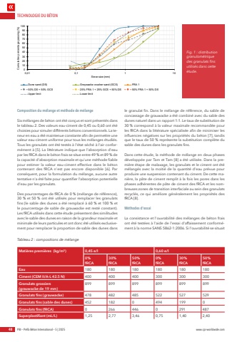 TECHNOLOGIE DU B%u00c9TON48 PBI %u2013 Pr%u00e9fa B%u00e9ton International %u2013 5 | 2025 www.cpi-worldwide.comComposition du m%u00e9lange et m%u00e9thode de m%u00e9langeSix m%u00e9langes de b%u00e9ton ont %u00e9t%u00e9 con%u00e7us et sont pr%u00e9sent%u00e9s dans le tableau 2. Des valeurs eau-ciment de 0,45 ou 0,60 ont %u00e9t%u00e9 choisies pour simuler diff%u00e9rents b%u00e9tons conventionnels. La teneur en eau a %u00e9t%u00e9 maintenue constante afin de permettre une valeur eau-ciment uniforme pour tous les m%u00e9langes %u00e9tudi%u00e9s. Tous les granulats ont %u00e9t%u00e9 test%u00e9s %u00e0 l'%u00e9tat s%u00e9ch%u00e9 %u00e0 l'air conform%u00e9ment %u00e0 [5]. La litt%u00e9rature indique que l'absorption d'eau par les fRCA dans le b%u00e9ton frais se situe entre 49 % et 89 % de la capacit%u00e9 d'absorption maximale et qu'une m%u00e9thode fiable pour estimer la valeur eau-ciment effective dans le b%u00e9ton contenant des fRCA n'est pas encore disponible [6]. Par cons%u00e9quent, pour la formulation du m%u00e9lange, aucune autre tentative n'a %u00e9t%u00e9 faite pour quantifier l'absorption potentielle d'eau par les granulats.Des pourcentages de fRCA de 0 % (m%u00e9lange de r%u00e9f%u00e9rence), 30 % et 50 % ont %u00e9t%u00e9 utilis%u00e9s pour remplacer les granulats fins (le sable des dunes a %u00e9t%u00e9 remplac%u00e9 %u00e0 60 % et 100 % et le pourcentage de sable de grauwacke est rest%u00e9 constant). Les fRCA utilis%u00e9s dans cette %u00e9tude pr%u00e9sentent des similitudes avec le sable des dunes en raison de la grandeur maximale et minimale de leurs particules et ont donc %u00e9t%u00e9 utilis%u00e9s exclusivement pour remplacer la proportion de sable des dunes dans le granulat fin. Dans le m%u00e9lange de r%u00e9f%u00e9rence, du sable de concassage de grauwacke a %u00e9t%u00e9 combin%u00e9 avec du sable des dunes naturel dans un rapport 1:1. Le taux de substitution de 30 % correspond %u00e0 la valeur maximale recommand%u00e9e pour les fRCA dans la litt%u00e9rature sp%u00e9cialis%u00e9e afin de minimiser les influences n%u00e9gatives sur les propri%u00e9t%u00e9s du b%u00e9ton [7], tandis que le taux de 50 % repr%u00e9sente la substitution compl%u00e8te du sable des dunes dans les granulats fins.Dans cette %u00e9tude, la m%u00e9thode de m%u00e9lange en deux phases d%u00e9velopp%u00e9e par Tam et Tam [8] a %u00e9t%u00e9 utilis%u00e9e. Dans la premi%u00e8re %u00e9tape de malaxage, les granulats et le ciment ont %u00e9t%u00e9 m%u00e9lang%u00e9s avec la moiti%u00e9 de la quantit%u00e9 d'eau pr%u00e9vue pour produire une suspension contenant du ciment. De cette mani%u00e8re, la p%u00e2te de ciment remplit %u00e0 la fois les pores dans les phases adh%u00e9rentes de p%u00e2te de ciment des fRCA et les nombreuses zones de transition interfaciale au sein des granulats recycl%u00e9s, ce qui am%u00e9liore g%u00e9n%u00e9ralement les propri%u00e9t%u00e9s des fRCA [8].M%u00e9thodes d'essaiLa consistance et l'ouvrabilit%u00e9 des m%u00e9langes de b%u00e9ton frais ont %u00e9t%u00e9 test%u00e9es %u00e0 l'aide de l'essai d'affaissement conform%u00e9ment %u00e0 la norme SANS 5862-1:2006. Si l'ouvrabilit%u00e9 se situait fifffifflfiffififlfi%u001afi%u0019fi%u0018fi%u0017fi%u0016fifffififi%u0015fiff fi%u0015ff ff fffi%u0014%u0013%u0012%u0013%u0011%u0010%u000f%u000e%u000c%u000b%u000c%u0009%u0008%u000c%u0007%u000f%u0010%u0006%u000c%u000b%u0010%u0005%u0005%u000e%u0007%u0006%u000b%u0004%u0003%u0001%u000e%u000c%u000c%u000b%u0005%u000e%u000c%u000b%u0004%u0012%u0012%u0081%u0013%u0007%u000c%u000b%u0005%u0010%u0007%u008d%u000b%u0004%u0081%u0001 %u008f%u0009%u000c%u0090%u009d%u0010%u0008%u00a0%u000c%u000b%u0008%u0009%u0013%u0005%u00ad%u000c%u0009%u000b%u0005%u0010%u0007%u008d%u000b%u0004%u008f%u0014%u0001 %u0080%u0082%u0083%u000bff%u001afi%u0003%u000b%u0081%u0001%u000b%u0084%u000b%u001afi%u0003%u000b%u008f%u0014%u0001 ffl%u001a%u0003%u000b%u0080%u0082%u0083%u000bff%u000b%u0084%u000bffl%u001a%u0003%u000b%u008f%u0014%u0001%u000b%u0084%u000b%u001afi%u0003%u000b%u0081%u0001 %u001afi%u0003%u000b%u0080%u0082%u0083%u000bff%u000b%u0084%u000b%u001afi%u0003%u000b%u0081%u0001%u0085%u000c%u0009%u000b%u0011%u000e%u0012%u000e%u000f %u0086%u0087%u009d%u000c%u0009%u000b%u0011%u000e%u0012%u000e%u000fFig. 1 : distribution granulom%u00e9trique des granulats fins utilis%u00e9s dans cette %u00e9tude.Tableau 2 : compositions de m%u00e9langeMati%u00e8res premi%u00e8res (kg/m%u00b3) 0,45 e/l 0,60 e/l0%fRCA30% fRCA50%fRCA0%fRCA30%fRCA50%fRCAEau 180 180 180 180 180 180Ciment (CEM II/A-L 42.5 N) 400 400 400 300 300 300Granulats grossiers (grauwacke de 19 mm) 899 899 899 899 899 899Granulats fins (grauwacke) 478 482 485 522 527 529Granulats fins (sable des dunes) 452 182 0 494 199 0Granulats fins (fRCA) 0 266 446 0 291 487Superplastifiant (mL/L) 1,25 2,77 3,46 0,75 1,40 2,40