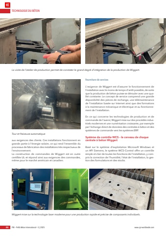 TECHNOLOGIE DU B%u00c9TON66 PBI %u2013 Pr%u00e9fa B%u00e9ton International %u2013 5 | 2025 www.cpi-worldwide.comaux exigences des clients. Ces installations fonctionnent en grande partie %u00e0 l'%u00e9nergie solaire, ce qui rend l'ensemble du processus de fabrication des installations tr%u00e8s respectueux de l'environnement.La construction de commandes de Wiggert est en outre certifi%u00e9e UL et r%u00e9pond ainsi aux exigences des commandes, m%u00eame pour le march%u00e9 am%u00e9ricain et canadien.Fourniture de servicesL'exigence de Wiggert est d'assurer le fonctionnement de l'installation avec le moins de temps d'arr%u00eat possible, de sorte que la production de b%u00e9ton puisse se d%u00e9rouler avec une qualit%u00e9 constante. Le concept de service comprend une grande disponibilit%u00e9 des pi%u00e8ces de rechange, une t%u00e9l%u00e9maintenance de l'installation bas%u00e9e sur Internet ainsi que des formations %u00e0 la maintenance m%u00e9canique et %u00e9lectrique et au fonctionnement de l'installation.En ce qui concerne les technologies de production et de commande de l'avenir, Wiggert mise sur des proc%u00e9d%u00e9s industriels modernes et une num%u00e9risation croissante, par exemple par l'%u00e9change direct de donn%u00e9es des centrales %u00e0 b%u00e9ton et des syst%u00e8mes de commande vers les syst%u00e8mes ERP.Syst%u00e8me de contr%u00f4le WCS %u2013 le cerveau de chaque centrale %u00e0 b%u00e9ton WiggertBas%u00e9 sur le syst%u00e8me d'exploitation Microsoft Windows et un API Siemens, le syst%u00e8me WCS-Control offre un contr%u00f4le simple et clair de toutes les fonctions de l'installation, y compris la correction de l'humidit%u00e9, l'%u00e9tat de l'installation, la gestion des formulations et des stocks. La visite de l'atelier de production permet de constater le grand degr%u00e9 d'int%u00e9gration de la production de Wiggert.Tour et fraiseuse automatiqueWiggert mise sur la technologie laser moderne pour une production rapide et pr%u00e9cise de composants individuels.