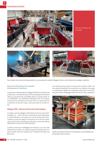 TECHNOLOGIE DU B%u00c9TON68 PBI %u2013 Pr%u00e9fa B%u00e9ton International %u2013 5 | 2025 www.cpi-worldwide.comApp pour les informations sur les donn%u00e9esde production de l'installationL'application d%u00e9velopp%u00e9e par Wiggert affiche les donn%u00e9es de production en temps r%u00e9el et permet des analyses de donn%u00e9es utiles qui peuvent %u00eatre consult%u00e9es dans le monde entier via un smartphone. Les utilisateurs disposent ainsi d'un aper%u00e7u compact de la production en temps r%u00e9el, non seulement sur l'ensemble du site de l'usine, mais aussi dans le monde entier.Wiggert USA %u2013 Advanced Concrete TechnologiesLe si%u00e8ge social de Wiggert USA (Advanced Concrete Technologies, Inc. %u2013 ACT) est situ%u00e9 %u00e0 Greenland, New Hampshire, au nord de Boston. Il comprend un centre de formation ultramoderne et sert de plaque tournante pour le service apr%u00e8svente, la formation, l'assistance technique, le stock de pi%u00e8ces d%u00e9tach%u00e9es, les ventes et l'administration.La filiale am%u00e9ricaine de Wiggert est devenue, au cours des 40 derni%u00e8res ann%u00e9es, l'un des principaux fournisseurs de centrales %u00e0 b%u00e9ton de haute qualit%u00e9 pour l'industrie du b%u00e9ton aux %u00c9tats-Unis.Les solutions sont toujours con%u00e7ues de mani%u00e8re %u00e0 offrir une tr%u00e8s grande flexibilit%u00e9 en proposant aux ma%u00eetres d'ouvrage la combinaison id%u00e9ale de composants %u00e9prouv%u00e9s. Les techniciens de service de Wiggert USA, form%u00e9s en usine, mettent en Pour obtenir des soudures impeccables et une production rapide, Wiggert mise sur des robots de soudage modernesApr%u00e8s la peinture finale, les composants sont emball%u00e9s pour le transport chez le client. Vue sur les stations de soudage