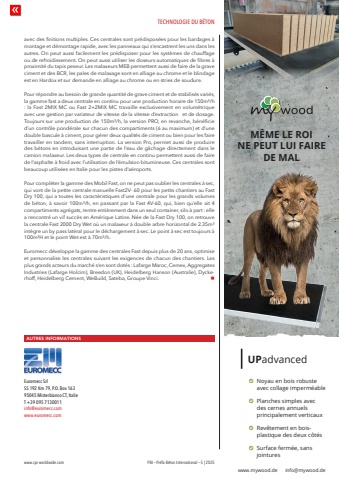 TECHNOLOGIE DU B%u00c9TONwww.cpi-worldwide.com PBI %u2013 Pr%u00e9fa B%u00e9ton International %u2013 5 | 2025avec des finitions multiples. Ces centrales sont pr%u00e9dispos%u00e9es pour les bardages %u00e0 montage et d%u00e9montage rapide, avec les panneaux qui s%u2019encastrent les uns dans les autres. On peut aussi facilement les pr%u00e9disposer pour les syst%u00e8mes de chauffage ou de refroidissement. On peut aussi utiliser les doseurs automatiques de fibres %u00e0 proximit%u00e9 du tapis peseur. Les malaxeurs MEB permettent aussi de faire de la grave ciment et des BCR, les pales de malaxage sont en alliage au chrome et le blindage est en Hardox et sur demande en alliage au chrome ou en stries de soudure.Pour r%u00e9pondre au besoin de grande quantit%u00e9 de grave ciment et de stabilis%u00e9s vari%u00e9s, la gamme fast a deux centrale en continu pour une production horaire de 150m%u00b3/h : la Fast 2MIX MC ou Fast 2+2MIX MC travaille exclusivement en volum%u00e9trique avec une gestion par variateur de vitesse de la vitesse d%u2019extraction et de dosage. Toujours sur une production de 150m%u00b3/h, la version PRO, en revanche, b%u00e9n%u00e9ficie d%u2019un contr%u00f4le pond%u00e9rale sur chacun des compartiments (6 au maximum) et d%u2019une double bascule %u00e0 ciment, pour g%u00e9rer deux qualit%u00e9s de ciment ou bien pour les faire travailler en tandem, sans interruption. La version Pro, permet aussi de produire des b%u00e9tons en introduisant une partie de l%u2019eau de g%u00e2chage directement dans le camion malaxeur. Les deux types de centrale en continu permettent aussi de faire de l%u2019asphalte %u00e0 froid avec l%u2019utilisation de l%u2019%u00e9mulsion bitumineuse. Ces centrales sont beaucoup utilis%u00e9es en Italie pour les pistes d%u2019a%u00e9roports.Pour compl%u00e9ter la gamme des Mobil Fast, on ne peut pas oublier les centrales %u00e0 sec, qui vont de la petite centrale manuelle Fast2V- 60 pour les petits chantiers au Fast Dry 100, qui a toutes les caract%u00e9ristiques d%u2019une centrale pour les grands volumes de b%u00e9ton, %u00e0 savoir 100m%u00b3/h, en passant par la Fast 4V-60, qui, bien qu%u2019elle ait 4 compartiments agr%u00e9gats, rentre enti%u00e8rement dans un seul container, silo %u00e0 part : elle a rencontr%u00e9 un vif succ%u00e8s en Am%u00e9rique Latine. N%u00e9e de la Fast Dry 100, on retrouve la centrale Fast 2000 Dry Wet o%u00f9 un malaxeur %u00e0 double arbre horizontal de 2.35m%u00b3 int%u00e8gre un by pass lat%u00e9ral pour le d%u00e9chargement %u00e0 sec. Le point %u00e0 sec est toujours %u00e0 100m%u00b3H et le point Wet est %u00e0 70m%u00b3/h.Euromecc d%u00e9veloppe la gamme des centrales Fast depuis plus de 20 ans, optimise et personnalise les centrales suivant les exigences de chacun des chantiers. Les plus grands acteurs du march%u00e9 s%u2019en sont dot%u00e9s : Lafarge Maroc, Cemex, Aggregates Industries (Lafarge Holcim), Breedon (UK), Heidelberg Hanson (Australie), Dyckerhoff, Heidelberg Cement, WeBuild, Sateba, Groupe Vinci. nAUTRES INFORMATIONSEuromecc SrlSS 192 Km 79, P.O. Box 16395045 Misterbianco CT, ItalieT +39 095 7130011info@euromecc.comwww.euromecc.comM%u00caME LE ROI NE PEUT LUI FAIRE DE MALwww.mywood.de info@mywood.deUPadvancedNoyau en bois robuste avec collage imperm%u00e9ablePlanches simples avec des cernes annuels principalement verticauxRev%u00eatement en boisplastique des deux c%u00f4t%u00e9sSurface ferm%u00e9e, sans jointures