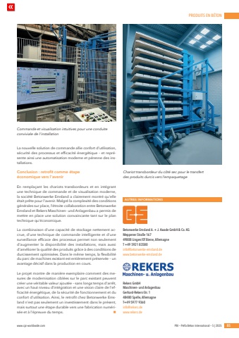 PRODUITS EN B%u00c9TONwww.cpi-worldwide.com PBI %u2013 Pr%u00e9fa B%u00e9ton International %u2013 5 | 2025 85La nouvelle solution de commande allie confort d'utilisation, s%u00e9curit%u00e9 des processus et efficacit%u00e9 %u00e9nerg%u00e9tique %u2013 et repr%u00e9sente ainsi une automatisation moderne et p%u00e9renne des installations.Conclusion : retrofit comme %u00e9tape %u00e9conomique vers l'avenirEn rempla%u00e7ant les chariots transbordeurs et en int%u00e9grant une technique de commande et de visualisation moderne, la soci%u00e9t%u00e9 Betonwerke Emsland a clairement montr%u00e9 qu'elle %u00e9tait pr%u00eate pour l'avenir. Malgr%u00e9 la complexit%u00e9 des conditions g%u00e9n%u00e9rales sur place, l'%u00e9troite collaboration entre Betonwerke Emsland et Rekers Maschinen- und Anlagenbau a permis de mettre en place une solution convaincante tant sur le plan technique qu'%u00e9conomique.La combinaison d'une capacit%u00e9 de stockage nettement accrue, d'une technique de commande intelligente et d'une surveillance efficace des processus permet non seulement d'augmenter la disponibilit%u00e9 des installations, mais aussi d'am%u00e9liorer la qualit%u00e9 des produits gr%u00e2ce %u00e0 des conditions de durcissement optimis%u00e9es. Dans le m%u00eame temps, la flexibilit%u00e9 du parc de machines existant est enti%u00e8rement pr%u00e9serv%u00e9e %u2013 un avantage d%u00e9cisif dans la production en cours.Le projet montre de mani%u00e8re exemplaire comment des mesures de modernisation cibl%u00e9es sur le parc existant peuvent cr%u00e9er une v%u00e9ritable valeur ajout%u00e9e %u2013 sans longs temps d'arr%u00eat, avec un haut niveau d'int%u00e9gration et une vision claire de l'efficacit%u00e9 %u00e9nerg%u00e9tique, de la s%u00e9curit%u00e9 de fonctionnement et du confort d'utilisation. Ainsi, le retrofit chez Betonwerke Emsland n'est pas seulement un investissement dans le pr%u00e9sent, mais surtout une %u00e9tape durable vers une fabrication num%u00e9ris%u00e9e et %u00e0 l'%u00e9preuve du temps. nAUTRES INFORMATIONSBetonwerke Emsland A. + J. Kwade GmbH & Co. KGMeppener Stra%u00dfe 16749808 Lingen/OT Biene, Allemagne T +49 5921 83580info@betonwerke-emsland.de www.betonwerke-emsland.deRekers GmbH Maschinen- und Anlagenbau Gerhard-Rekers-Str. 1 48480 Spelle, Allemagne T+49 5977 9360 info@rekers.dewww.rekers.deCommande et visualisation intuitives pour une conduite conviviale de l'installationChariot transbordeur du c%u00f4t%u00e9 sec pour le transfert des produits durcis vers l%u2019empaquetage
