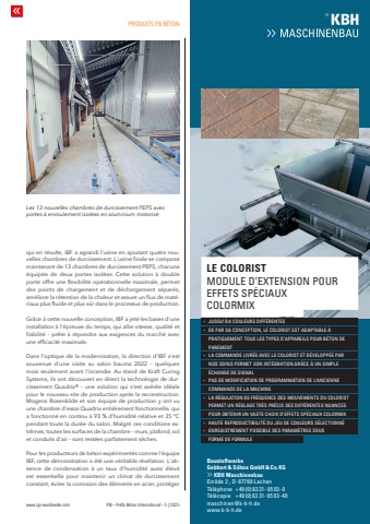 PRODUITS EN B%u00c9TONwww.cpi-worldwide.com PBI %u2013 Pr%u00e9fa B%u00e9ton International %u2013 5 | 2025qui en r%u00e9sulte, IBF a agrandi l'usine en ajoutant quatre nouvelles chambres de durcissement. L'usine finale se compose maintenant de 13 chambres de durcissement PEPS, chacune %u00e9quip%u00e9e de deux portes isol%u00e9es. Cette solution %u00e0 double porte offre une flexibilit%u00e9 op%u00e9rationnelle maximale, permet des points de chargement et de d%u00e9chargement s%u00e9par%u00e9s, am%u00e9liore la r%u00e9tention de la chaleur et assure un flux de mat%u00e9riaux plus fluide et plus s%u00fbr dans le processus de production.Gr%u00e2ce %u00e0 cette nouvelle conception, IBF a jet%u00e9 les bases d'une installation %u00e0 l'%u00e9preuve du temps, qui allie vitesse, qualit%u00e9 et fiabilit%u00e9 %u2013 pr%u00eate %u00e0 r%u00e9pondre aux exigences du march%u00e9 avec une efficacit%u00e9 maximale.Dans l'optique de la modernisation, la direction d'IBF s'est souvenue d'une visite au salon bauma 2022 %u2013 quelques mois seulement avant l'incendie. Au stand de Kraft Curing Systems, ils ont d%u00e9couvert en direct la technologie de durcissement Quadrix%u00ae %u2013 une solution qui s'est av%u00e9r%u00e9e id%u00e9ale pour le nouveau site de production apr%u00e8s la reconstruction. Mogens Rosenkilde et son %u00e9quipe de production y ont vu une chambre d'essai Quadrix enti%u00e8rement fonctionnelle, qui a fonctionn%u00e9 en continu %u00e0 93 % d'humidit%u00e9 relative et 35 %u00b0C pendant toute la dur%u00e9e du salon. Malgr%u00e9 ces conditions extr%u00eames, toutes les surfaces de la chambre %u2013 murs, plafond, sol et conduits d'air %u2013 sont rest%u00e9es parfaitement s%u00e8ches.Pour les producteurs de b%u00e9ton exp%u00e9riment%u00e9s comme l'%u00e9quipe IBF, cette d%u00e9monstration a %u00e9t%u00e9 une v%u00e9ritable r%u00e9v%u00e9lation. L'absence de condensation %u00e0 un taux d'humidit%u00e9 aussi %u00e9lev%u00e9 est essentielle pour maintenir un climat de durcissement constant, %u00e9viter la corrosion des %u00e9l%u00e9ments en acier, prot%u00e9ger Les 13 nouvelles chambres de durcissement PEPS avec portes %u00e0 enroulement isol%u00e9es en aluminium motoris%u00e9q%u00e5 *5315%u0007%u00c3%u00e5%u0016%u00e5#/5,%523%u00e5$)&&%u00bb2%.4%3q%u00e5 $%%u00e50!2%u00e53!%u00e5#/.#%04)/.%u000c%u00e5,%%u00e5#/,/2)34%u00e5%34%u00e5!$!04!\%u00e5 02!4)15%-%.4%u00e54/53%u00e5,%3%u00e5490%3%u00e5$%u0007!00!2%),3%u00e50/52%u00e5\%u00e5 0!2%-%.4q%u00e5 ,!%u00e5#/--!.$%%u00e5,)62%u00bb%%u00e5!6%#%u00e5,%%u00e5#/,/2)34%u00e5%4%u00e5$%u00bb6%,/00%u00bb%%u00e50!2%u00e5%u00e5 ./3%u00e53/).3%u00e50%2-%4%u00e53/.%u00e5).4%u00bb'2!4)/.%u00e5'2%u00b8#%%u00e5%u00c3%u00e55.%u00e53)-0,%%u00e5%u00e5%u00e5 %u00bb#(!.'%%u00e5$%%u00e53)'.!,q%u00e5 0!3%u00e5$%%u00e5-/$)&)#!4)/.%u00e5$%%u00e502/'2!--!4)/.%u00e5$%%u00e5,%u0007!.#)%..%%u00e5%u00e5%u00e5 #/--!.$%%u00e5$%%u00e5,!%u00e5-!#().%q%u00e5 ,!%u00e52%u00bb'5,!4)/.%u00e5$%%u00e5&2%u00bb15%.#%%u00e5$%3%u00e5-/56%-%.43%u00e5$5%u00e5#/,/2)34%u00e5%u00e5%u00e5 0%2-%4%u00e55.%u00e52%u00bb',!'%%u00e542%u00b33%u00e502%u00bb#)3%u00e5$%3%u00e5$)&&%u00bb2%.4%3%u00e5.5!.#%3%u00e5%u00e5%u00e5 0/52%u00e5/\q%u00e5 (!54%%u00e52%02/$5#4)\q%u00e5 %.2%')342%-%.4%u00e50/33)\%u00e5 &/2-%%u00e5$%%u00e5&/2-5,%%u00a7,%%u00e5#/,/2)34%u00e5-/$5,%%u00e5$%u0007%84%.3)/.%u00e50/52%u00e5%&&%43%u00e530%u00bb#)!58%u00e5#/,/2-)8%u00e5%u00e5\'EBHART%u00e5%u0006%u00e53%u009aHNE%u00e5'MB(%u00e5%u0006%u00e5#O%u000e%u00e5+'%u00e5%u00e5%u00e5%u00e5 +\%IN%u009aDE%u00e5%u0012%u00e5%u000c%u00e5$%u0018%u0017%u0017%u0016%u0010%u00e5,ACHEN4%u00a3L%u00a3PHONE%u00e5 %u000b%u0014%u0019%u00e5%u0008%u0010%u0009 %u0018%u0013 %u0013%u0011 %u0019%u0015 %u0010%u0013%u00104%u00a3L%u00a3COPIE%u00e5 %u000b%u0014%u0019%u00e5%u0008%u0010%u0009 %u0018%u0013 %u0013%u0011 %u0019%u0015 %u0010%u0013%u0014%u0010MASCHINEN KBH%u000eDEWWW%u000eKBH%u000eDE