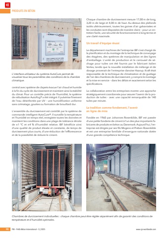 PRODUITS EN B%u00c9TON90 PBI %u2013 Pr%u00e9fa B%u00e9ton International %u2013 5 | 2025 www.cpi-worldwide.comcentral avec syst%u00e8me de clapets %u00e9vacue l'air chaud et humide %u00e0 la fin du cycle de durcissement et maintient ainsi la stabilit%u00e9 du climat. Pour un contr%u00f4le pr%u00e9cis de l'humidit%u00e9, le syst%u00e8me de n%u00e9bulisation AutoFog%u00ae a %u00e9t%u00e9 int%u00e9gr%u00e9. Il pulv%u00e9rise finement de l'eau d%u00e9sinfect%u00e9e par UV %u2013 une humidification uniforme sans colmatage, gouttes ou formation de brouillard dur.L'ensemble du durcissement est contr%u00f4l%u00e9 par le syst%u00e8me de commande intelligent AutoCure%u00ae. Il surveille la temp%u00e9rature et l'humidit%u00e9 en temps r%u00e9el, enregistre toutes les donn%u00e9es et maintient les conditions dans une plage de tol%u00e9rance %u00e9troite de %u00b11 %u00b0C et %u00b14 % d'humidit%u00e9 relative. IBF b%u00e9n%u00e9ficie ainsi d'une qualit%u00e9 de produit %u00e9lev%u00e9e et constante, de temps de durcissement plus courts, d'une r%u00e9duction de l'efflorescence et de la possibilit%u00e9 de r%u00e9duire le ciment.Chaque chambre de durcissement mesure 17,00 m de long, 3,20 m de large et 4,00 m de haut. Au-dessus des plafonds isol%u00e9s ult%u00e9rieurement, toutes les gaines d'air galvanis%u00e9es et les conduites sont dispos%u00e9es de mani%u00e8re claire %u2013 pour un entretien facile, une s%u00e9curit%u00e9 de fonctionnement %u00e0 long terme et une clart%u00e9 maximale.Un travail d'%u00e9quipe r%u00e9ussiLe d%u00e9partement machines de l'entreprise IBF s'est charg%u00e9 de la planification et du montage de la technique de convoyage des %u00e9tag%u00e8res, des syst%u00e8mes de manipulation et des lignes d'emballage. L'unit%u00e9 de production et le carrousel de s%u00e9chage pour tuiles ont %u00e9t%u00e9 fournis par le fabricant italien Vortex, tandis que la nouvelle installation de m%u00e9lange et de dosage provenait de l'entreprise danoise Haarup. Kraft %u00e9tait responsable de la technique de climatisation et de guidage de l'air des chambres de durcissement, y compris le montage et la mise en service %u2013 dans les d%u00e9lais et exactement selon les sp%u00e9cifications.La collaboration entre les entreprises montre une approche strat%u00e9giquement coordonn%u00e9e pour assurer l'avenir de la production de tuiles %u2013 avec une capacit%u00e9 remarquable de 140 tuiles par minute.La tradition comme fondement, l'avenir en ligne de mireFond%u00e9e en 1960 par Johannes Rosenkilde, IBF est pass%u00e9e d'une petite fonderie de ciment %u00e0 l'un des plus importants fabricants de produits en b%u00e9ton au Danemark. Aujourd'hui, l'entreprise est dirig%u00e9e par ses fils Mogens et Preben Rosenkilde et est une entreprise familiale d'envergure nationale dot%u00e9e d'une grande comp%u00e9tence technique.L'interface utilisateur du syst%u00e8me AutoCure permet de visualiser tous les param%u00e8tres des conditions de la chambre climatique.Chambres de durcissement individuelles : chaque chambre peut %u00eatre r%u00e9gl%u00e9e s%u00e9par%u00e9ment afin de garantir des conditions de temp%u00e9rature et d'humidit%u00e9 optimales.