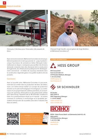 PRODUITS EN B%u00c9TON96 PBI %u2013 Pr%u00e9fa B%u00e9ton International %u2013 5 | 2025 www.cpi-worldwide.comDans cet environnement, Mehramat Concretes est remarquablement positionn%u00e9 en tant que premier et %u2013 jusqu'%u00e0 pr%u00e9sent %u2013unique fournisseur de produits en b%u00e9ton fabriqu%u00e9s industriellement en Assam. L'entreprise peut profiter tr%u00e8s t%u00f4t de la demande croissante dans des domaines tels la construction de logements, les infrastructures publiques et le d%u00e9veloppement commercial %u2013 et %u00e9tablir de nouveaux standards dans la construction r%u00e9gionale gr%u00e2ce %u00e0 la qualit%u00e9 moderne de ses produits.ConclusionAvec la nouvelle usine, Mehramat Concretes n'a pas seulement fait son entr%u00e9e dans la production de blocs de b%u00e9ton, mais a en m%u00eame temps r%u00e9alis%u00e9 un concept de production d'avenir sur le plan technologique et %u00e9cologique. La combinaison d'une propre base de mati%u00e8res premi%u00e8res, d'une technique de machines ultramoderne et de partenariats solides avec Hess Group, Topwerk Inde et SR Schindler constitue la base d'un positionnement r%u00e9ussi sur le march%u00e9 %u2013 et montre comment la confiance, la technologie et la durabilit%u00e9 permettent d'emprunter de nouvelles voies dans l'industrie des blocs en b%u00e9ton. nAUTRES INFORMATIONSHESS Group GmbH Freier-Grund-Stra%u00dfe 123 57299 Burbach-Wahlbach, Allemagne T +49 2736 49760 info@hessgroup.com www.hessgroup.comSR Schindler Hofer Stra%u00dfe 24 93057 Regensburg, Allemagne T + 49 941 696820 info@sr-schindler.com www.sr-schindler.comROTHO %u2013 Robert Thomas Metall- und Elektrowerke GmbH & Co. KG Hellerstra%u00dfe 657290 Neunkirchen, Allemagne T +49 2735 7880 sales@rotho.dewww.rotho.deConvoyeur %u00e0 barreaux pour l'%u00e9vacuation des paquets de blocsCharanjit Singh Gandhi, associ%u00e9 g%u00e9rant de Singh Brothers et Mehramat Concretes LLPGr%u00e2ce %u00e0 HESS GROUP, tous les lecteurs de PBI ont la possibilit%u00e9 de t%u00e9l%u00e9charger cet article en version pdf. Veuillez consulter le site internetwww.cpi-worldwide.com/ channels/topwerk ou scanner le code QR avec votre smartphone pour acc%u00e9der directement %u00e0 ce site internet.