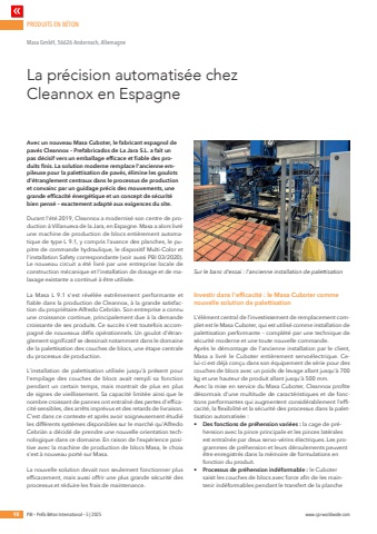 PRODUITS EN B%u00c9TON98 PBI %u2013 Pr%u00e9fa B%u00e9ton International %u2013 5 | 2025 www.cpi-worldwide.comAvec un nouveau Masa Cuboter, le fabricant espagnol de pav%u00e9s Cleannox %u2013 Prefabricados de La Jara S.L. a fait un pas d%u00e9cisif vers un emballage efficace et fiable des produits finis. La solution moderne remplace l'ancienne empileuse pour la palettisation de pav%u00e9s, %u00e9limine les goulots d'%u00e9tranglement centraux dans le processus de production et convainc par un guidage pr%u00e9cis des mouvements, une grande efficacit%u00e9 %u00e9nerg%u00e9tique et un concept de s%u00e9curit%u00e9 bien pens%u00e9 %u2013 exactement adapt%u00e9 aux exigences du site.Durant l'%u00e9t%u00e9 2019, Cleannox a modernis%u00e9 son centre de production %u00e0 Villanueva de la Jara, en Espagne. Masa a alors livr%u00e9 une machine de production de blocs enti%u00e8rement automatique de type L 9.1, y compris l'avance des planches, le pupitre de commande hydraulique, le dispositif Multi-Color et l'installation Safety correspondante (voir aussi PBI 03/2020). Le nouveau circuit a %u00e9t%u00e9 livr%u00e9 par une entreprise locale de construction m%u00e9canique et l'installation de dosage et de malaxage existante a continu%u00e9 %u00e0 %u00eatre utilis%u00e9e.La Masa L 9.1 s'est r%u00e9v%u00e9l%u00e9e extr%u00eamement performante et fiable dans la production de Cleannox, %u00e0 la grande satisfaction du propri%u00e9taire Alfredo Cebri%u00e1n. Son entreprise a connu une croissance continue, principalement due %u00e0 la demande croissante de ses produits. Ce succ%u00e8s s'est toutefois accompagn%u00e9 de nouveaux d%u00e9fis op%u00e9rationnels. Un goulot d'%u00e9tranglement significatif se dessinait notamment dans le domaine de la palettisation des couches de blocs, une %u00e9tape centrale du processus de production.L'installation de palettisation utilis%u00e9e jusqu'%u00e0 pr%u00e9sent pour l'empilage des couches de blocs avait rempli sa fonction pendant un certain temps, mais montrait de plus en plus de signes de vieillissement. Sa capacit%u00e9 limit%u00e9e ainsi que le nombre croissant de pannes ont entra%u00een%u00e9 des pertes d'efficacit%u00e9 sensibles, des arr%u00eats impr%u00e9vus et des retards de livraison.C'est dans ce contexte et apr%u00e8s avoir soigneusement %u00e9tudi%u00e9 les diff%u00e9rents syst%u00e8mes disponibles sur le march%u00e9 qu'Alfredo Cebri%u00e1n a d%u00e9cid%u00e9 de prendre une nouvelle orientation technologique dans ce domaine. En raison de l'exp%u00e9rience positive avec la machine de production de blocs Masa, le choix s'est %u00e0 nouveau port%u00e9 sur Masa.La nouvelle solution devait non seulement fonctionner plus efficacement, mais aussi offrir une plus grande s%u00e9curit%u00e9 des processus et r%u00e9duire les frais de maintenance.Investir dans l'efficacit%u00e9 : le Masa Cuboter comme nouvelle solution de palettisationL'%u00e9l%u00e9ment central de l'investissement de remplacement complet est le Masa Cuboter, qui est utilis%u00e9 comme installation de palettisation performante %u2013 compl%u00e9t%u00e9 par une technique de s%u00e9curit%u00e9 moderne et une toute nouvelle commande.Apr%u00e8s le d%u00e9montage de l'ancienne installation par le client, Masa a livr%u00e9 le Cuboter enti%u00e8rement servo%u00e9lectrique. Celui-ci est d%u00e9j%u00e0 con%u00e7u dans son %u00e9quipement de s%u00e9rie pour des couches de blocs avec un poids de levage allant jusqu'%u00e0 700 kg et une hauteur de produit allant jusqu'%u00e0 500 mm.Avec la mise en service du Masa Cuboter, Cleannox profite d%u00e9sormais d'une multitude de caract%u00e9ristiques et de fonctions performantes qui augmentent consid%u00e9rablement l'efficacit%u00e9, la flexibilit%u00e9 et la s%u00e9curit%u00e9 des processus dans la palettisation automatis%u00e9e :%u2022 Des fonctions de pr%u00e9hension vari%u00e9es : la cage de pr%u00e9hension avec la pince principale et les pinces lat%u00e9rales est entra%u00een%u00e9e par deux servo-v%u00e9rins %u00e9lectriques. Les programmes de pr%u00e9hension et leurs d%u00e9roulements peuvent %u00eatre enregistr%u00e9s dans la m%u00e9moire de formulations en fonction du produit.%u2022 Processus de pr%u00e9hension ind%u00e9formable : le Cuboter saisit les couches de blocs avec force afin de les maintenir ind%u00e9formables pendant le transfert de la planche La pr%u00e9cision automatis%u00e9e chez Cleannox en EspagneMasa GmbH, 56626 Andernach, Allemagne Sur le banc d'essai : l'ancienne installation de palettisation