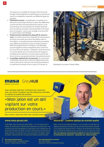 PRODUITS EN B%u00c9TONwww.cpi-worldwide.com PBI %u2013 Pr%u00e9fa B%u00e9ton International %u2013 5 | 2025 99de support sur la palette de transport. Des barres de serrage interchangeables et sp%u00e9cifiques aux produits assurent une adaptation optimale aux diff%u00e9rents types de produits.%u2022 Palettisation pr%u00e9cise : la palettisation compl%u00e8te et enti%u00e8rement automatique de blocs %u00e0 partir des diff%u00e9rentes couches de blocs est particuli%u00e8rement pr%u00e9cise. Le paquet de blocs est ainsi pr%u00e9par%u00e9 de mani%u00e8re optimale pour les stations suivantes, dans lesquelles il sera trait%u00e9 pour le transport %u2013 par ex. par cerclage, mise sous film ou autres %u00e9tapes d'emballage.%u2022 Positionnement individuel du dispositif de retournement : le positionnement du dispositif de retournement se fait par une saisie sous forme de tableau dans la formulation. Un positionnement individuel est possible pour diff%u00e9rents produits. En outre, d'autres fonctions telles les programmes de centrage ou de d%u00e9calage peuvent %u00e9galement %u00eatre enregistr%u00e9es dans la formulation sous forme de tableau. L'utilisation d'entra%u00eenements %u00e0 courroie dent%u00e9e pour les m%u00e9canismes de levage et de d%u00e9placement permet une transmission pr%u00e9cise des forces ainsi qu'une grande pr%u00e9cision de positionnement.%u2022 Un guidage optimis%u00e9 des mouvements : la commande cin%u00e9matique calcule des courbes de d%u00e9placement pr%u00e9cises et permet de contourner les bords perturbateurs en optimisant le temps et les %u00e0-coups. Le Cuboter se Montage du nouveau Cuboter MasaMasa GmbH GreyHUB Andernach Concrete Block, Pavers + Landscaping ProductsMasa-Str. 2 | 56626 Andernach | GermanyMasa GmbH WhiteHUB Porta WestfalicaAAC + Sand-lime BrickOsterkamp 2 | 32457 Porta Westfalica | GermanyChez Masa, nous ne pensons qu%u2018au b%u00e9ton %u2013 et %u00e0 la mani%u00e8re de le mettre en forme pour l%u2018industrie des mat%u00e9riaux de construction. Les machines que nous d%u00e9veloppons et fabriquons sont utilis%u00e9es pour la production de blocs de b%u00e9ton, de blocs silicocalcaires et de blocs de b%u00e9ton cellulaire. Autrement dit, nous sommes de v%u00e9ritables %u00abt%u00eates de b%u00e9ton%u00bb, passionn%u00e9s par les machines fi ables et performantes.Bj%u00f6rn, l%u2018une de nos %u00abt%u00eates de b%u00e9ton%u00bb, a mis au point un outil pour les lignes de production de blocs qui fournit des informations pr%u00e9cises sur la qualit%u00e9 des produits frais. Il mesure les dimensions de chaque bloc et identifi e les d%u00e9fauts tels que les fi ssures ou les boules de ciment. Pour une d%u00e9tection automatique de d%u00e9fauts en cours de production et d%u2018%u00e9conomies de ressources %u2013 demandez aux %u00abt%u00eates de b%u00e9ton%u00bb.Vous souhaitez optimiser l%u2018utilisation des ressources, mais vos clients n%u2018acceptent que des tol%u00e9rances minimales en mati%u00e8re de qualit%u00e9 des produits.%u00abMon jalon est un %u0153il vigilant sur votre production en cours.%u00bbBj%u00f6rn Herborn, D%u00e9partment R&D, Masa GreyHUB, Andernachwww.masa-group.com NOUVEAU ! Syst%u00e8me optique de contr%u00f4le qualit%u00e9ma-0000805