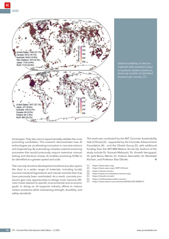 NEWS16 CPI %u2013 Concrete Plant International | India Edition %u2013 5 | 2025 www.cpi-worldwide.comterial types. They also aim to experimentally validate the most promising candidates. This research demonstrates how AI technologies are accelerating innovation in concrete science and engineering. By automating complex material screening processes that would previously require extensive manual testing and literature review, AI enables promising SCMs to be identified at a greater speed and scale. This not only shortens development timelines but also opens the door to a wider range of materials, including locally sourced industrial byproducts and natural minerals that may have previously been overlooked. As a result, concrete producers gain new opportunities to design more resource-efficient mixes tailored to specific environmental and economic goals. In doing so, AI supports industry efforts to reduce carbon emissions while maintaining strength, durability, and safety standards.The work was conducted by the MIT Concrete Sustainability Hub (CSHub) [3] %u2013 supported by the Concrete Advancement Foundation [4] %u2013 and the Olivetti Group [5], with additional funding from the MIT-IBM Watson AI Lab [6]. Authors of the study include Dr. Soroush Mahjoubi, Dr. Vineeth Venugopal, Dr. Ipek Bensu Manav, Dr. Hessam AzariJafari, Dr. Randolph Kirchain, and Professor Elsa Olivetti. n[1] https://www.astm.org/[2] https://store.astm.org/c1897-20.html[3] https://cshub.mit.edu/[4] https://www.concreteadvancement.org/[5] https://olivetti.mit.edu/[6] https://mitibmwatsonailab.mit.edu/[7] https://www.nature.com/articles/s43246-025-00820-4Global availability of reactive materials with pozzolanic (top) or hydraulic (bottom) behavior, shown by number of identified locations per country. [7]