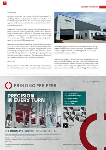 CONCRETE TECHNOLOGYwww.cpi-worldwide.com CPI %u2013 Concrete Plant International | India Edition %u2013 5 | 2025 31EngineeringWiggert%u2019s engineers are experts in the development and industrial production of equipment for the manufacture of all kind of concrete products. The focus lies on integrating the systems and components into the customers%u2019 downstream production systems.Nowadays more than ever before, Wiggert sees itself as a team player that works in partnership and assumes responsibility to create added value for its customers. Both technical expertise and many years of experience in the various fields of concrete application is what the company brings to the table for the benefit of its customers.Reliability, adherence to deadlines, and consistent quality are just a few of the many qualities that customers and partners worldwide appreciate about Wiggert. Wiggert relies on advanced engineering to meet customer requirements with enhanced flexibility, efficiency and with higher quality, allowing in cooperation with its customers the importance of concrete as a building material to be carried into the future.FabricationWiggert relies on state-of-the-art machinery for its production. Customized plants are manufactured using automatic laser cutting systems, bending machines, and welding robots, which precisely fabricate the plant components to meet customer requirements. These manufacturing systems are mostly powered by solar energy, making the entire production process very environmentally conscious. Wiggert%u2019s manufacture Recently, Wiggert invested into a second production facility in Karlsruhe-Palmbach, as the capacities at the headquarters were no longer sufficient and further growth was not possible due to the local conditions.www.prinzing-pfeiffer.comAchieve unparalleled results with cutting-edge radial press technology designed for the most demanding concrete pipe production needs.Whether for reinforced or non-reinforced concrete pipes, according to internationalstandards, the Radial Press is your partner in delivering durable, high-quality solutions %u2013 every time.Leading with Innovation, inspired by Traditionsince 1862Short Cycle Times /High Production OutputFast Mold ChangeHighest Reliabilitywith low WearPrecisionin every Turn The Radial PRess RP by Prinzing PFeiFFer Downloadbrochures