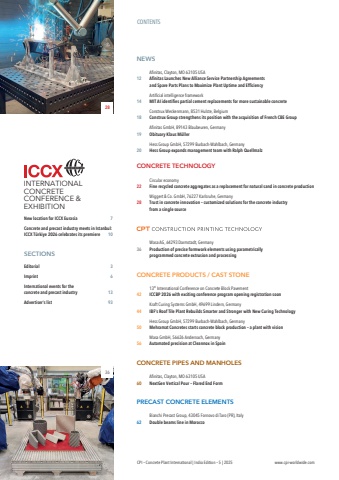 CPI %u2013 Concrete Plant International | India Edition %u2013 5 | 2025 www.cpi-worldwide.comCONTENTSNEWSAfinitas, Clayton, MO 63105 USA12%u0009 AfinitasLaunches New Alliance Service Partnership Agreementsand Spare Parts Plans to Maximize Plant Uptime and EfficiencyArtificial intelligence framework14%u0009 MIT AI identifies partial cement replacements for more sustainable concreteConstrux Weckenmann, 8531 Hulste, Belgium18%u0009 Construx Group strengthens its position with the acquisition of French CBE GroupAfinitas GmbH, 89143 Blaubeuren, Germany19%u0009 Obituary Klaus M%u00fcller Hess Group GmbH, 57299 Burbach-Wahlbach, Germany 20%u0009 Hess Group expands management team with Ralph QuellmalzCONCRETE TECHNOLOGYCircular economy 22%u0009 Fine recycled concrete aggregates as a replacement for natural sand in concrete productionWiggert & Co. GmbH, 76227 Karlsruhe, Germany 28%u0009 Trust in concrete innovation %u2013 customized solutions for the concrete industryfrom a single sourceWasa AG, 64293 Darmstadt, Germany36%u0009 Production of precise formwork elements using parametricallyprogrammed concrete extrusion and processingCONCRETE PRODUCTS / CAST STONE13th International Conference on Concrete Block Pavement42%u0009 ICCBP 2026 with exciting conference program opening registration soonKraft Curing Systems GmbH, 49699 Lindern, Germany44%u0009 IBF%u2019s Roof Tile Plant Rebuilds Smarter and Stronger with New Curing TechnologyHess Group GmbH, 57299 Burbach-Wahlbach, Germany50%u0009 Mehramat Concretes starts concrete block production %u2013 a plant with visionMasa GmbH, 56626 Andernach, Germany 56%u0009 Automated precision at Cleannox in SpainCONCRETE PIPES AND MANHOLESAfinitas, Clayton, MO 63105 USA60%u0009 NextGen Vertical Pour %u2013 Flared End FormPRECAST CONCRETE ELEMENTSBianchi Precast Group, 43045 Fornovo di Taro (PR), Italy62%u0009 Double beams line in Morocco3628New location for ICCX Eurasia 7Concrete and precast industry meets in Istanbul:ICCX T%u00fcrkiye 2026 celebrates its premiere 10SECTIONSEditorial%u0009 3Imprint%u0009 6International events for theconcrete and precast industry%u0009 13Advertiser%u2019s list%u0009 93INTERNATIONAL CONCRETECONFERENCE & EXHIBITION