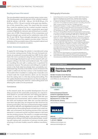 40 CPI %u2013 Concrete Plant International | India Edition %u2013 5 | 2025 www.cpi-worldwide.comRecycling and reuse of the materialThe pre-shredded material was recycled using a turbo rotor. The resulting grain size distribution of the recycled material (0.05 % 160 %u00b5m, 1.45 % 90 - 160 %u00b5m, 10.5 % 45-90 %u00b5m, 3 % 32-45 %u00b5m, 95 % < 32 %u00b5m) is similar to the grain size distribution of the mineral flour used. This meant that the mineral flour could be replaced by the crushed recycled material, while the proportions of the other components were kept constant. Eligibility for extrusion was achieved up to a substitution rate of 50%. Characterisation of the compressive and flexural strength was carried out for substitution rates of 25, 50, 75 and 100 %. These strengths deviated by a maximum of 10 % from those of the original concrete recipe. This is an indication of the successful reuse of the recycled material and the realisation of a material circulation.Outlook - Demonstrator productionTo apply the technology, the planter is manufactured using the concrete casting process. Firstly, the outer formwork elements are produced conventionally from GRP. On the other hand, the core is produced using the near-net-shape extrusion technology developed as part of this research with subsequent milling in the fresh and hardened state. The model for moulding the core with a casting resin is quartered for production reasons. The extrusion and milling of a model element in the fresh state has already been successfully completed (see Figs. 4 and 6). In the further course of research, the model is milled into the final contour in the hardened state. The model is then moulded in a casting resin. A wooden core is fixed inside the mould element, which can be removed from the casting resin in a first step during demoulding. The thin-walled, flexible formwork element can then be easily demoulded, eliminating the need for a demoulding bevel and allowing the undercut to be produced.ConclusionsIn this research work, the successful development of an additive process for the sustainable production of a new formwork based on concrete extrusion and milling was demonstrated. A new fine concrete mixture with CEM III/A was developed and characterised, which enables processing in the fresh and hardened state. After the concrete elements have been extruded, they are shaped into their final form by brushing and milling. The new combined technology enables the resource-efficient and digitalised production of complex models without demoulding bevels and with local undercuts. After use as formwork, the recycling process of the concrete elements is continued and the recycled material is fed back into the printing process. The result is a complex technology consisting of the following steps: near-net-shape extrusion, brushing and milling in the fresh and hardened state, moulding with casting resin, production of precast concrete parts, recycling of concrete models, reuse for additive manufacturing. nBibliography & footnotes1. United Nations Environment Programme (2022). 2022 Global Status Report for Buildings and Construction: Towards a Zero-emission, Efficient and Resilient Buildings and Construction Sector. Nairobi2. S. Gelbrich, M. Absto%u00df, H. Funke: Complex concrete elements for the production of recyclable formwork by extrusion and milling, December 2023, ce/papers 6(6):729-734, DOI: 10.1002/cepa.2815 3. M. Absto%u00df, E. Rudolph, H. Funke, S. Gelbrich (2021) 3D printing and milling of complex concrete elements for the production of casting resin molds. In: CPT worldwide - construction printing technology, 2021. CPT Worldwide, Nr.: 2, 2021, S.14-20, ISSN 2629-15924. Gliniorz, R.: Energy-Efficient Reinforced Heating System Implemented as a Carbon Concrete Formwork. Springer Nature Switzerland AG 2023 Z. Zembaty et al. (Eds.): ECCE 2022, LNCE 322, pp. 258%u2013272, 20235. Lindner, M.; Scharf-Wildenhain, R.; Gliniorz, R.; Vanselow, K.; Funke, H.; Gelbrich, S.; Kroll, L. (2021) Kalibrierverfahren f%u00fcr konstante Materialstr%u00e4nge bei robotergest%u00fctzter Betonextrusion. Beton- und Stahlbetonbau 116, Sonderheft Schneller Bauen, 116, Ernst & Sohn 2021, pp. 42-47, ISSN 1437-1006. https://doi.org/10.1002/best.2021000516. Lindner, M.; Mandel, K.; Gelbrich, S.; Funke, H.; Kroll, L. (2021) Kontinuierliche Fertigung von d%u00fcnnwandigen faserverst%u00e4rkten Pr%u00e4zisions-Betonelementen f%u00fcr freigeformte Mo-dulbauweisen (KoBeMo). BetonWerk International Nr. 1, 2021, pp. 28-29, ISSN 1437-9023.chttps://www.cpi-worldwide.com/images/cpi/flips/2021/1/en/index.html?#p=28 7. Verein Deutscher Zementwerke e.V: Umwelt-Produktdeklaration - Portlandzement (CEM I), EPD-VDZ-20220153-IAG1-DE, 08.06.2022 8. Verein Deutscher Zementwerke e.V: Umwelt-Produktdeklaration - Hochofenzement (CEM III/A), EPD-VDZ-20220154-IAG1-DE, 09.06.2022FURTHER INFORMATIONSteinbeis Innovation Centre FiberCreteOtto-Schmerbach-Str. 19, Hall 12, 09117 Chemnitz, Germanysu1612@stw.de, www.fibercrete.deTechnical University of ChemnitzInstitute for Lightweight StructuresDepartment of Lightweight ConstructionReichenhainer Str. 33, Room 00809126 Chemnitz, Germanywww.leichtbau.tu-chemnitz.de/research-area/lbw/WASA AG Europaplatz 4, 64293 Darmstadt, Germany T +49 6151 7808500 info@wasa-technologies.comwww.wasa-technologies.com