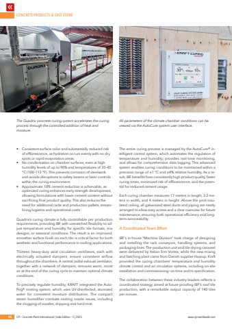 CONCRETE PRODUCTS & CAST STONE46 CPI %u2013 Concrete Plant International | India Edition %u2013 5 | 2025 www.cpi-worldwide.com%u2022 Consistent surface color and substantially reduced risk of efflorescence, as hydration occurs evenly with no dry spots or rapid evaporation areas.%u2022 No condensation on chamber surfaces, even at high humidity levels of up to 90% and temperatures of 35%u201345 %u00b0C (100%u2013113 %u00b0F). This prevents corrosion of steelwork and avoids disruptions to safety beams or laser controls within the curing environment.%u2022 Approximate 10% cement reduction is achievable, as optimized curing enhances early strength development, allowing formulations with lower cement content without sacrificing final product quality. This also reduces the need for additional racks and production pallets, streamlining logistics and operational costsQuadrix%u2019s curing climate is fully controllable per production requirements, providing IBF with unmatched flexibility to adjust temperature and humidity for specific tile formats, mix designs, or seasonal conditions. The result is an improved, smoother surface finish on each tile%u2014a critical factor for both aesthetic and functional performance in roofing applications.Thirteen heavy-duty axial circulation ventilators, each with electrically actuated dampers, ensure consistent airflow throughout the chambers. A central radial exhaust ventilator, together with a network of dampers, removes warm, moist air at the end of the curing cycle to maintain optimal climate conditions. To precisely regulate humidity, KRAFT integrated the AutoFog%u00ae misting system, which uses UV-disinfected, atomized water for consistent moisture distribution. The compact steam humidifier combats misting nozzle issues, including the clogging of nozzles, dripping and hard mist. The entire curing process is managed by the AutoCure%u00ae intelligent control system, which automates the regulation of temperature and humidity, provides real-time monitoring, and allows for comprehensive data logging. This advanced system enables curing conditions to be maintained within a precision range of %u00b11 %u00b0C and %u00b14% relative humidity. As a result, IBF benefits from consistently high product quality, faster curing times, minimized risk of efflorescence, and the potential for reduced cement usage.Each curing chamber measures 17 meters in length, 3.2 meters in width, and 4 meters in height. Above the post-insulated ceiling, all galvanized steel ducts and piping are neatly arranged to allow easy access and a clear overview for future maintenance, ensuring both operational efficiency and longterm serviceability.A Coordinated Team EffortIBF%u2019s in-house %u201cMachine Division%u201d took charge of designing and installing the rack conveyors, handling systems, and packaging lines. The production unit and tile drying carousel were delivered by Italian firm Vortex, while the new mixing and batching plant came from Danish supplier Haarup. Kraft provided the curing chambers%u2019 temperature and humidity climate control and air circulation systems, including on-site installation and commissioning%u2014on time and to specification.The collaboration between these industry leaders reflects a coordinated strategy aimed at future-proofing IBF%u2019s roof tile production, with a remarkable output capacity of 140 tiles per minute.The Quadrix concrete curing system accelerates the curing process through the controlled addition of heat and moisture.All parameters of the climate chamber conditions can be viewed via the AutoCure system user interface.