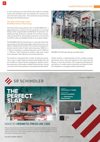 CONCRETE PRODUCTS & CAST STONEwww.cpi-worldwide.com CPI %u2013 Concrete Plant International | India Edition %u2013 5 | 2025 51to start producing concrete blocks was made for strategic reasons: By utilising its own raw materials, the company can cover the entire value chain - from extraction and processing through to the finished product.The plant's technology centre: RH 2000-4 VA from Hess GroupThe heart of the new production line is the RH 2000-4 VA - a high-performance machine for the production of concrete blocks, which is appreciated worldwide for its precision, durability and high production capacity. The machine was specially developed for demanding production environments and offers maximum flexibility thanks to its modular design.The RH 2000-4 VA from Hess Group is a concrete block making machine of the latest generation, which was put into operation at Mehramat Concretes. The machine processes production boards made of sheet steel measuring 1,400 mm %u00d7 1,150 mm, resulting in a usable production area of 1,300 mm %u00d7 1,100 mm. These dimensions enable a high cycle output and contribute to the efficiency of overall production.The machine is equipped with a variety of optional accessories to cover a wide range of products with heights from 25 mm to 500 mm. These include a polystyrene insertion unit for the production of thermally insulated hollow blocks, a facing concrete unit for the production of paving blocks with sophisticated surfaces, a drawing plate unit for creating complex geometries and a colour-mix system for the multi-coloured design of concrete products. This equipment facilitates the production of a wide variety of products and allows for flexible adaptation to changing market requirements.RH2000-4 VA with open facing concrete sectionwww.sr-schindler.comEffi cient slab production redefi ned: The Hermetic Press delivers highest quality standards,reliable dosing, precisest tolerances and accuracy. Patented solutions simplify operations,while access to over 1,500 exclusive designs opens new creative possibilities. Built for performance, tailored to your needs.Innovative. Reliable. Effi cient.HighestPerformance & QualityMaximizedMachine AvailabilityLow MaintenanceRequirementsTHEPERFECTSLABMADE BY HERMETIC PRESS UNI 1200Downloadbrochures