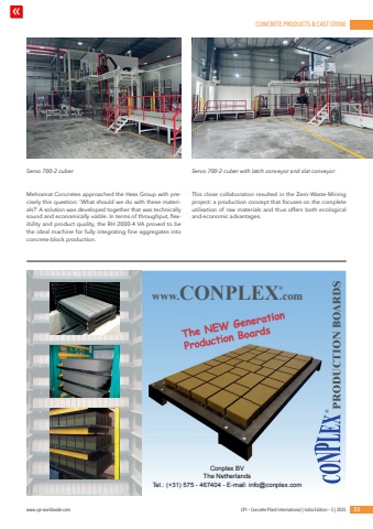 CONCRETE PRODUCTS & CAST STONEwww.cpi-worldwide.com CPI %u2013 Concrete Plant International | India Edition %u2013 5 | 2025 53Mehramat Concretes approached the Hess Group with precisely this question: %u2018What should we do with these materials?%u2019 A solution was developed together that was technically sound and economically viable. In terms of throughput, flexibility and product quality, the RH 2000-4 VA proved to be the ideal machine for fully integrating fine aggregates into concrete block production.This close collaboration resulted in the Zero-Waste-Mining project: a production concept that focuses on the complete utilisation of raw materials and thus offers both ecological and economic advantages.Servo 700-2 cuber Servo 700-2 cuber with latch conveyor and slat conveyorwww.CONPLEX.com%u00ae%u00aeConplex BVThe NetherlandsTel.: (+31) 575 - 467404 - E-mail: info@conplex.com
