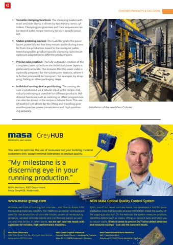 CONCRETE PRODUCTS & CAST STONEwww.cpi-worldwide.com CPI %u2013 Concrete Plant International | India Edition %u2013 5 | 2025 57%u2022 Versatile clamping functions: The clamping basket with main and side clamp is driven by two electric servo cylinders. Clamping programmes and their sequences can be stored in the recipe memory for each specific product.%u2022 Stable grabbing process: The Cuboter grabs the paver layers powerfully so that they remain stable during transfer from the production board to the transport pallet. Interchangeable, product-specific clamping rails ensure optimum adaptation to different product types. %u2022 Precise cube creation: The fully automatic creation of the complete paver cube from the individual paver layers is particularly accurate. This ensures that the paver cube is optimally prepared for the subsequent stations, where it is further processed for transport %u2013 for example, by strapping, foiling or other packaging steps. %u2022 Individual turning device positioning: The turning device is positioned via a tabular input in the recipe. Individual positioning is possible for different products. Additional functions such as centring or offset programmes can also be stored in the recipe in tabular form. The use of toothed belt drives for the lifting and travelling gear enables precise power transmission and high positioning accuracy. Installation of the new Masa CuboterMasa GmbH GreyHUB Andernach Concrete Block, Pavers + Landscaping ProductsMasa-Str. 2 | 56626 Andernach | GermanyMasa GmbH WhiteHUB Porta WestfalicaAAC + Sand-lime BrickOsterkamp 2 | 32457 Porta Westfalica | GermanyAt Masa, we think of nothing but concrete %u2013 and how to shape it for the building materials industry. The machines we design and build are used for the production of concrete blocks, pavers or landscaping products, aerated concrete blocks and (reinforced) panels as well as sand-lime bricks. In other words, we are real concrete heads with a passion for reliable, high-performance machines.Bj%u00f6rn, one of our clever concrete heads, has developed a tool for paver production lines that provides precise information about the quality of the ongoing production. On the wet side, the system measures products, identifi es defects such as cracks, liftings or cement balls and helps you to reduce waste. When it comes to precise 24/7 inline defect detection and resource savings %u2013 just ask the concrete heads.You want to optimise the use of resources but your building material customers only accept minimal tolerances in product quality.%u201cMy milestone is a discerning eye in your running production.%u201dBj%u00f6rn Herborn, R%u2009&%u2009D DepartmentMasa GreyHUB, AndernachNEW Masa Optical Quality Control SystemMasa Sales Offi ce India18th Floor, Cyber One, Sec-30 | Vashi, Navi MumbaiMaharashtra 400703 | Indiawww.masa-group.comma-0000805