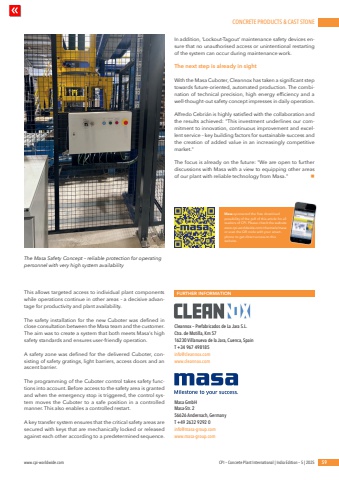 CONCRETE PRODUCTS & CAST STONEwww.cpi-worldwide.com CPI %u2013 Concrete Plant International | India Edition %u2013 5 | 2025 59This allows targeted access to individual plant components while operations continue in other areas %u2013 a decisive advantage for productivity and plant availability.The safety installation for the new Cuboter was defined in close consultation between the Masa team and the customer. The aim was to create a system that both meets Masa's high safety standards and ensures user-friendly operation.A safety zone was defined for the delivered Cuboter, consisting of safety gratings, light barriers, access doors and an ascent barrier. The programming of the Cuboter control takes safety functions into account. Before access to the safety area is granted and when the emergency stop is triggered, the control system moves the Cuboter to a safe position in a controlled manner. This also enables a controlled restart.A key transfer system ensures that the critical safety areas are secured with keys that are mechanically locked or released against each other according to a predetermined sequence. In addition, %u2018Lockout-Tagout%u2019 maintenance safety devices ensure that no unauthorised access or unintentional restarting of the system can occur during maintenance work.The next step is already in sightWith the Masa Cuboter, Cleannox has taken a significant step towards future-oriented, automated production. The combination of technical precision, high energy efficiency and a well-thought-out safety concept impresses in daily operation.Alfredo Cebri%u00e1n is highly satisfied with the collaboration and the results achieved: \mitment to innovation, continuous improvement and excellent service %u2013 key building factors for sustainable success and the creation of added value in an increasingly competitive market.\The focus is already on the future: \discussions with Masa with a view to equipping other areas of our plant with reliable technology from Masa.\nFURTHER INFORMATIONCleannox %u2013 Prefabricados de La Jara S.L.Ctra. de Motilla, Km 57 16230 Villanueva de la Jara, Cuenca, SpainT +34 967 498185info@cleannox.comwww.cleannox.comMasa GmbHMasa-Str. 256626 Andernach, GermanyT +49 2632 9292 0info@masa-group.comwww.masa-group.comThe Masa Safety Concept %u2013 reliable protection for operating personnel with very high system availabilityMasa sponsored the free download possibility of the pdf of this article for all readers of CPI. Please check the website www.cpi-worldwide.com/channels/masa or scan the QR code with your smartphone to get direct access to this website.
