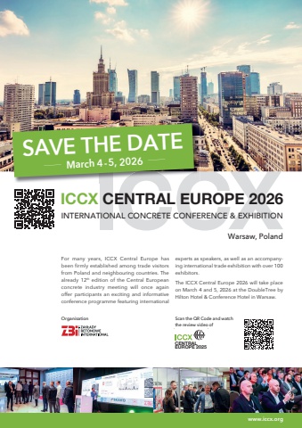 INTERNATIONAL CONCRETE CONFERENCE & EXHIBITIONICCX CENTRAL EUROPE 2026For many years, ICCX Central Europe has been firmly established among trade visitors from Poland and neighbouring countries. The already 12th edition of the Central European concrete industry meeting will once again offer participants an exciting and informative conference programme featuring international experts as speakers, as well as an accompanying international trade exhibition with over 100 exhibitors.The ICCX Central Europe 2026 will take place on March 4 and 5, 2026 at the DoubleTree by Hilton Hotel & Conference Hotel in Warsaw._ March 4 - 5, 2026SAVE THE DATE _Warsaw, PolandOrganisation Scan the QR Code and watchthe review video ofCENTRALEUROPE 2025www.iccx.org
