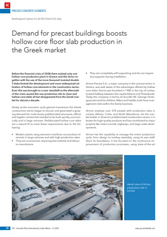 PRECAST CONCRETE ELEMENTS78 CPI %u2013 Concrete Plant International | India Edition %u2013 5 | 2025 www.cpi-worldwide.comBefore the financial crisis of 2008 there existed only one hollow core production plant in Greece and this factor together with the use of the more favoured inverted double T-slabs limited the development and more widespread utilization of hollow core elements in the construction sector. Even this was brought to a near standstill as the aftermath of the crisis caused this one production site to close and hollow core slabs all but disappeared from the Greek market for almost a decade.Slowly as the economic cycle gained momentum the Greek construction sector began to recover and generated a growing demand for multi-storey prefabricated structures, offices and logistic centres that needed to be built quickly, economically and in large volumes. Prefabricated hollow core slabs are a natural fit to meet these requirements due to the following:%u2022 Modern plants using extrusion machines can produce elements in large volumes and with high production rates%u2022 They are economical, requiring less material and labour to manufacture%u2022 They are completely self-supporting and do not require any supports during installation.Armos Precast S.A., a major company in the precast sector in Greece, was well aware of the advantages offered by hollow core slabs. Armos was founded in 1985 in the city of Larissa, located halfway between the capital Athens and Thessaloniki. Today the company is led by its founder Mr. George Orologopoulos and his children, Nikos and Vasiliki, both have management roles within the family business.Armos employs over 270 people with production sites in Larissa, Athens, Crete, and North Macedonia. As the market leader in Greece%u2019s prefabricated construction sector, it is known for high-quality products and has contributed to major projects like metro tunnels, highways, and large-scale developments.Armos has the capability to manage the entire production cycle, from design to turnkey assembly, using its own staff. Since its foundation, it has focused on the continuous improvement of production processes, using state-of-the-art Demand for precast buildings boosts hollow core floor slab production in the Greek marketNordimpianti System Srl, 66100 Chieti (CH), ItalyAerial view of Armos production site in Larissa