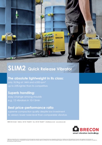 BRECON GmbH %u00b7 Telefon +49 221 9544270 %u00b7 Fax +49 221 9544277 %u00b7 info@brecon.de %u00b7 www.brecon.de* BRECON Au%u00dfenr%u00fcttler mit SL Charakteristik(Synchronlauf) erreichen exakt die von der Frequenzsteuerung vorgegebene Drehzahl, z.B. 6000rpm bei 100Hz elektrischer Frequenz. Die Angaben sind bezogen auf Au%u00dfenr%u00fcttler, die die gleichen Charakteristik aufweisen wie BRECON SL-R%u00fcttler. BRECON SL-R%u00fcttler sind in der Geschwindigkeit regelbar. Die SLIM2 Schnellspannhalterung ist auch f%u00fcr BRECON Hochfrequenz und BRECON Normalfrequenz R%u00fcttler einsetzbar.SLIM2 Quick Release VibratorThe absolute lightweight in its class:only 18,9kg at 14kN and 6.000 rpm*up to 25% lighter than its competitorsSuperb handling:easy change among mouldse.g. 12 vibrators in 10-15minBest price-performance ratiosupreme compaction quality despite low investmentSL version: lower noise level than comparable vibrators