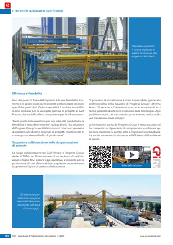 ELEMENTI PREFABBRICATI IN CALCESTRUZZO100 C&PI %u2013 Calcestruzzo & Prefabbricazione International %u2013 5 | 2025 www.cpi-worldwide.comEfficienza e flessibilit%u00e0Uno dei punti di forza dell%u2019impianto %u00e8 la sua flessibilit%u00e0. Il sistema %u00e8 in grado di produrre prodotti personalizzati secondo specifiche particolari. Questa versatilit%u00e0 %u00e8 risultata incredibilmente preziosa per la variegata gamma di progetti di Gulf Precast, che va dalle ville ai componenti per le infrastrutture.%u201cNella scelta della macchina per noi, oltre alla produttivit%u00e0, la flessibilit%u00e0 %u00e8 stata determinante%u201d, spiega Blonk. %u201cLa soluzione di Progress Group ha soddisfatto i nostri criteri e ci permette di adattarci alle diverse esigenze di progetti, mantenendo al contempo un elevato livello di produzione%u201d.Supporto e collaborazione nella riorganizzazione di aziendeLa lunga collaborazione tra Gulf Precast e Progress Group risale al 2006 con l%u2019introduzione di un impianto di raddrizzatura e taglio MSR ancora oggi operativo. L%u2019impianto per la produzione di reti elettrosaldate acquistato recentemente rappresenta l%u2019apice di questa collaborazione.%u201cIl processo di installazione %u00e8 stato impeccabile, grazie alla professionalit%u00e0 della squadra di Progress Group%u201d, afferma Aoun. %u201cIl servizio e l'assistenza sono stati eccezionali e ci hanno garantito di ottenere il massimo dalla tecnologia. Ogni problema tecnico %u00e8 stato risolto prontamente, assicurando una transizione senza intoppi%u201d.La formazione svolta da Progress Group %u00e8 stata accurata ed ha consentito ai dipendenti di comprendere e utilizzare appieno la macchina. E questo, oltre a migliorare la produttivit%u00e0, ha anche aumentato la sicurezza e l%u2019efficienza dell%u2019ambiente di lavoro.Flessibile e preciso: il nuovo impianto si adatta facilmente alle esigenze dei clienti.Gli elementi prefabbricati vengono depositati temporaneamente nell%u2019area di stoccaggio.Video della relazione