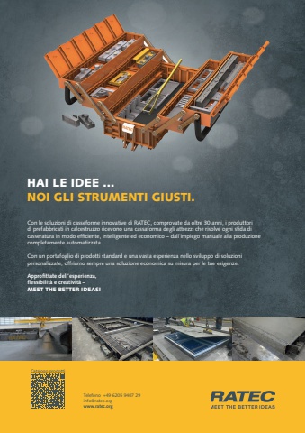 Telefono +49 6205 9407 29info@ratec.orgwww.ratec.orgCatalogo prodottiCon le soluzioni di casseforme innovative di RATEC, comprovate da oltre 30 anni, i produttori di prefabbricati in calcestruzzo ricevono una cassaforma degli attrezzi che risolve ogni sfi da di casseratura in modo effi ciente, intelligente ed economico %u2013 dall%u2019impiego manuale alla produzione completamente automatizzata.Con un portafoglio di prodotti standard e una vasta esperienza nello sviluppo di soluzioni personalizzate, offriamo sempre una soluzione economica su misura per le tue esigenze.Approfittate dell%u2019esperienza, flessibilit%u00e0 e creativit%u00e0 %u2013MEET THE BETTER IDEAS!HAI LE IDEE ...NOI GLI STRUMENTI GIUSTI.