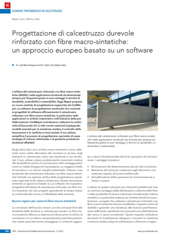 ELEMENTI PREFABBRICATI IN CALCESTRUZZO108 C&PI %u2013 Calcestruzzo & Prefabbricazione International %u2013 5 | 2025 www.cpi-worldwide.comL'utilizzo del calcestruzzo rinforzato con fibre macro-sintetiche (MSFRC) nelle applicazioni strutturali sta diventando sempre pi%u00f9 frequente grazie ai suoi vantaggi in termini di durabilit%u00e0, costruibilit%u00e0 e sostenibilit%u00e0. Oggi Mapei propone un nuovo metodo di progettazione supportato da CivilMapei, un software di progettazione strutturale che consente ai progettisti di utilizzare efficacemente il calcestruzzo rinforzato con fibre macro-sintetiche, in particolare nelle applicazioni in ambito industriale e nell%u2019industria della prefabbricazione. CivilMapei contribuisce a ottenere la conformit%u00e0 all'Eurocode 2(1) e alle norme nazionali impiegando modelli avanzati per la resistenza residua, il controllo delle fessurazioni e le verifiche in fase iniziale. Il suo utilizzo semplifica il processo di progettazione, permette di usare strategie di rinforzo ottimizzate e di garantire prestazioni strutturali affidabili.Negli ultimi dieci anni, le fibre macro-sintetiche si sono affermate come valida alternativa alle armature in acciaio negli elementi in calcestruzzo, siano essi strutturali o non strutturali. Il loro utilizzo risolve problematiche importanti relative alla durabilit%u00e0 (in primis, la corrosione) e offre vantaggi pratici come un ridotto bisogno di manodopera, un maggiore livello di sicurezza e un minore impatto ambientale. Tuttavia, l'uso strutturale del calcestruzzo rinforzato con fibre macro-sintetiche richiede una rigorosa verifica della progettazione, soprattutto negli stati limite ultimo e d%u2019esercizio. Questo documento presenta un approccio basato su un software che supporta i progettisti nell%u2019utilizzo di calcestruzzo rinforzato con fibre macro-sintetiche nei loro progetti, garantendo al tempo stesso la conformit%u00e0 alle norme e l'affidabilit%u00e0 delle strutture.Buone ragioni per usare le fibre macro-sinteticheLa corrosione dell'acciaio rimane uno dei principali limiti alla durabilit%u00e0 delle strutture in calcestruzzo armato. Le fibre macro-sintetiche offrono un sistema di rinforzo privo di rischio di corrosione con un ottimo comportamento post-fessurazione, che risulta particolarmente vantaggioso in ambienti aggressivi o dove %u00e8 fondamentale ridurre le operazioni di manutenzione. I vantaggi includono:%u2022 Eliminazione del deterioramento dovuto alla corrosione%u2022 Riduzione del carbonio contenuto negli elementi in calcestruzzo rispetto all'acciaio tradizionale%u2022 Semplificazione delle operazioni di movimentazione e messa in opera.L%u2019utilizzo di questa soluzione per elementi prefabbricati trae un ulteriore vantaggio dalla distribuzione uniforme delle fibre e dalla possibilit%u00e0 di ridurre o eliminare il tradizionale rinforzo metallico, in particolare laddove sia richiesta facilit%u00e0 di manutenzione. I progetti che utilizzano calcestruzzo rinforzato con fibre macro-sintetiche devono soddisfare i requisiti minimi di duttilit%u00e0 e garantire una resistenza alla trazione post-fessurazione sufficiente, soprattutto se si prevede una ridistribuzione del carico o azioni accidentali. Questi requisiti richiedono strumenti di modellazione adeguati a simulare la resistenza a trazione residua dopo le sollecitazioni a flessione e taglio.Progettazione di calcestruzzo durevole rinforzato con fibre macro-sintetiche: un approccio europeo basato su un softwareMapei S.p.A., Milano, Italian Dr. Jos%u00e9 Mar%u00eda Vaquero and Dr. Carles Cots, Mapei, ItaliaL'utilizzo del calcestruzzo rinforzato con fibre macro-sintetiche nelle applicazioni strutturali sta diventando sempre pi%u00f9 frequente grazie ai suoi vantaggi in termini di durabilit%u00e0, costruibilit%u00e0 e sostenibilit%u00e0.