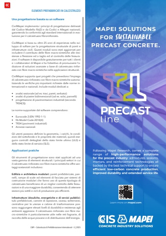 ELEMENTI PREFABBRICATI IN CALCESTRUZZOC&PI %u2013 Calcestruzzo & Prefabbricazione International %u2013 5 | 2025Una progettazione basata su un softwareCivilMapei implementa i principi di progettazione delineati dal Codice Modello fib(2) e da Codici e Allegati nazionali, garantendo la conformit%u00e0 agli standard internazionali in evoluzione per il calcestruzzo fibrorinforzato.CivilMapei si basa su oltre 25 anni di esperienza nello sviluppo di softare per la progettazione strutturale di ponti e infrastrutture civili. Questi moduli sono stati aggiornati per includere il contributo delle fibre macro-sintetiche alle resistenze a flessione ed a taglio ed al controllo delle fessurazioni. Il software %u00e8 disponibile gratuitamente per tutti i clienti e i collaboratori di Mapei e ha l%u2019obiettivo di promuovere l'adozione di soluzioni avanzate a base di calcestruzzo rinforzato con fibre macro-sintetiche nelle applicazioni strutturali.CivilMapei supporta quei progetti che prevedono l%u2019impiego di calcestruzzo rinforzato con fibre macro-sintetiche automatizzando le verifiche pi%u00f9 importanti richieste dalle norme internazionali e nazionali. Include moduli dedicati a:%u2022 analisi sezionale (ad es. travi, pareti, serbatoi)%u2022 analisi di piastre bidimensionali (ad es. solai, pannelli)%u2022 progettazione di pavimentazioni industriali (secondo TR34(3)).Le norme supportate dal software comprendono:%u2022 Eurocode 2 (EN 1992-1-1)%u2022 fib Model Code 2010(4)%u2022 TR34 (pavimenti industriali)%u2022 Annessi nazionaliGli utenti possono definire la geometria, i carichi, le condizioni del sottofondo e le propriet%u00e0 dei materiali, quindi eseguire controlli dettagliati dello stato limite ultimo (ULS) e dello stato limite di servizio (SLS).Applicazioni praticheGli strumenti di progettazione sono stati applicati ad una vasta gamma di elementi strutturali. I principali settori in cui il calcestruzzo rinforzato con fibre macro-sintetiche offre vantaggi sostanziali includono:Edilizia e architettura modulari: pareti prefabbricate, pannelli, rampe di scale ed elementi di facciata per sistemi di costruzione modulari che fanno uso di questa tipologia di calcestruzzo beneficiano di un miglior controllo delle fessurazioni e di una maggiore durabilit%u00e0, consentendo di ottenere sezioni pi%u00f9 sottili e cicli di produzione pi%u00f9 efficienti.Infrastrutture idrauliche, energetiche e di servizi pubblici:tubi prefabbricati, camere di ispezione, caveau sotterranei, centraline per le utenze e cabine di trasformazione possono raggiungere elevati livelli di durabilit%u00e0 e resistenza agli ambienti aggressivi. Il calcestruzzo rinforzato con fibre macro-sintetiche %u00e8 particolarmente utile nelle reti fognarie, di raccolta delle acque piovane e di distribuzione dell'energia.MAPEI SOLUTIONSFOR SUSTAINABLEPRECAST CONCRETE.